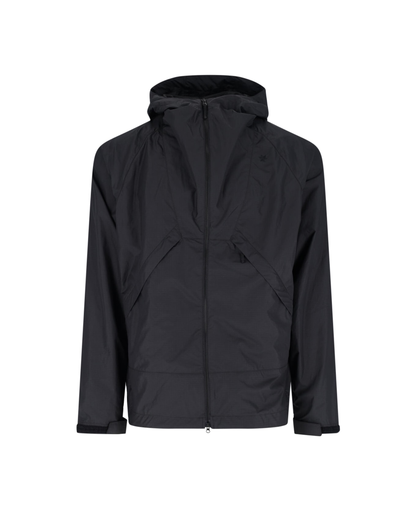 Goldwin waterproof zip jacket in black fabric with drawstring hood, double zip closure, tone-on-tone logo embroidery, two maxi side zip flap pockets, strap on cuffs, drawstring detail on the bottom, straight hem.
