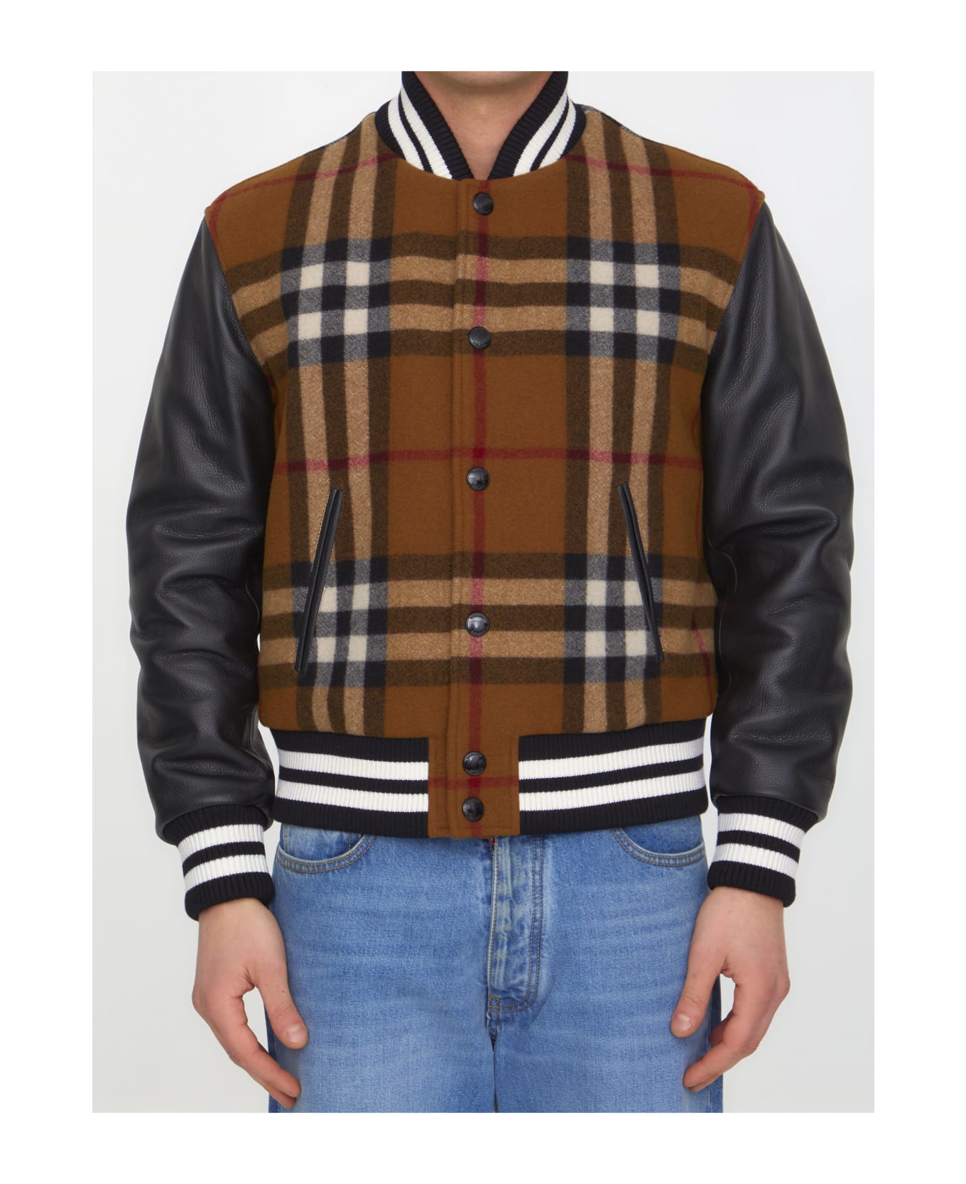 Lightly padded bomber jacket in technical wool with Check motif in the shades of brown and black calfskin sleeves. It features front press-stud closure, two side welt pockets and rib-knit striped trims on collar, cuffs and hem. Relaxed fit. The model is 190cm tall and wears size 48.