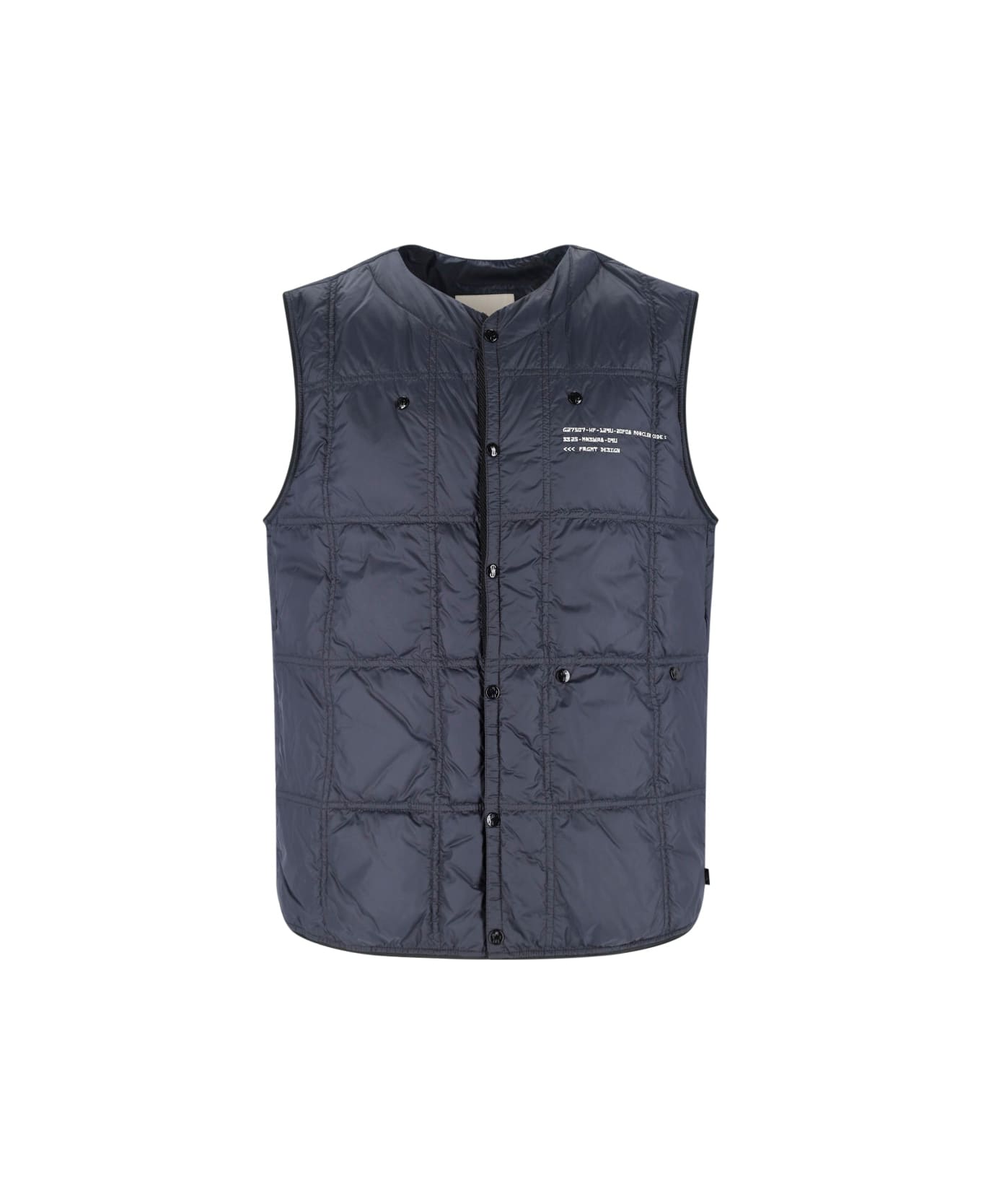 Moncler Genius X FRGMT "Vaile" padded vest in navy blue nylon with check pattern, quilted and padded design, V-neck, button closure, white logo embroidery on the chest, tone-on-tone embroidered logo on the back, logo patch detail, elastic hem.