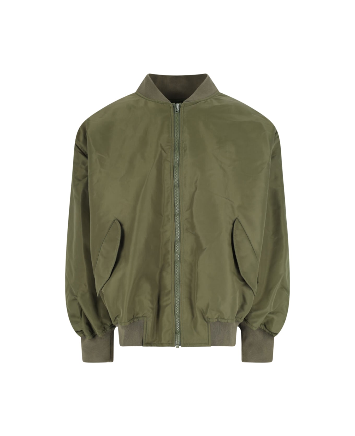 Hed Mayner green nylon zip bomber jacket with crew neck, zip closure, two side flap pockets, ribbed trims, straight hem.