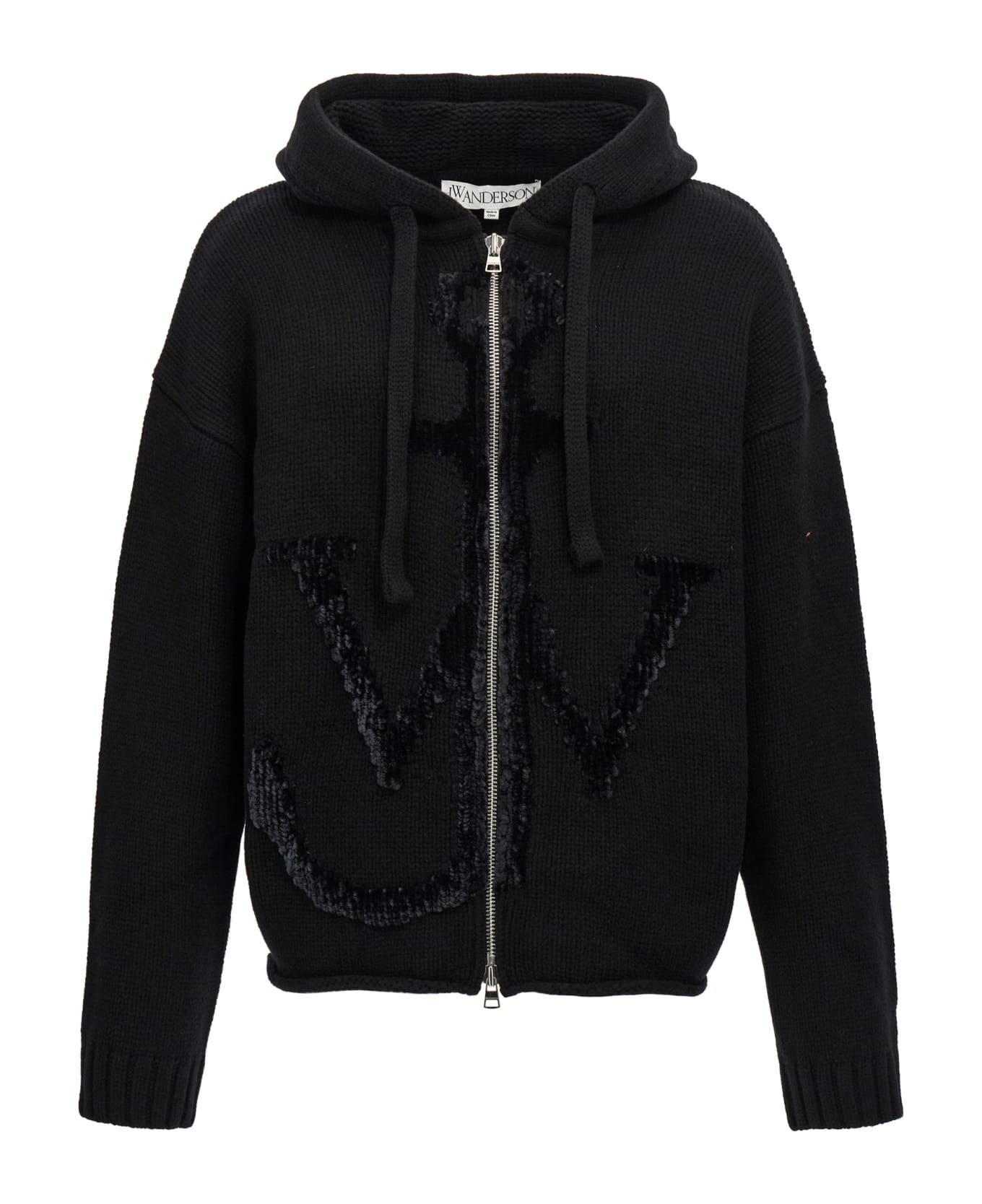 Wool knit hoodie with front chenille 'Anchor JWA' logo, zip closure, long sleeves.