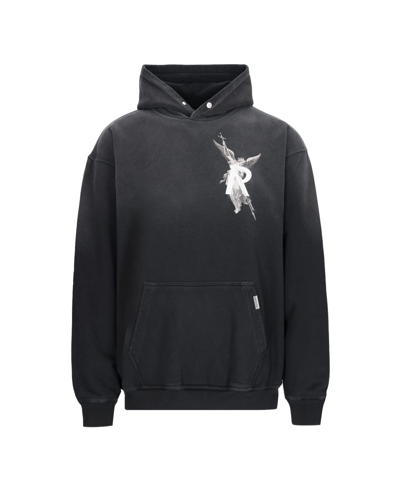 Represent 'Archangel Hoodie' black cotton sweatshirt with distressed wash, hood, contrast chest print, maxi front pocket, silver metal tag detail with embossed logo, contrast maxi print on the back, ribbed trims, straight hem.
