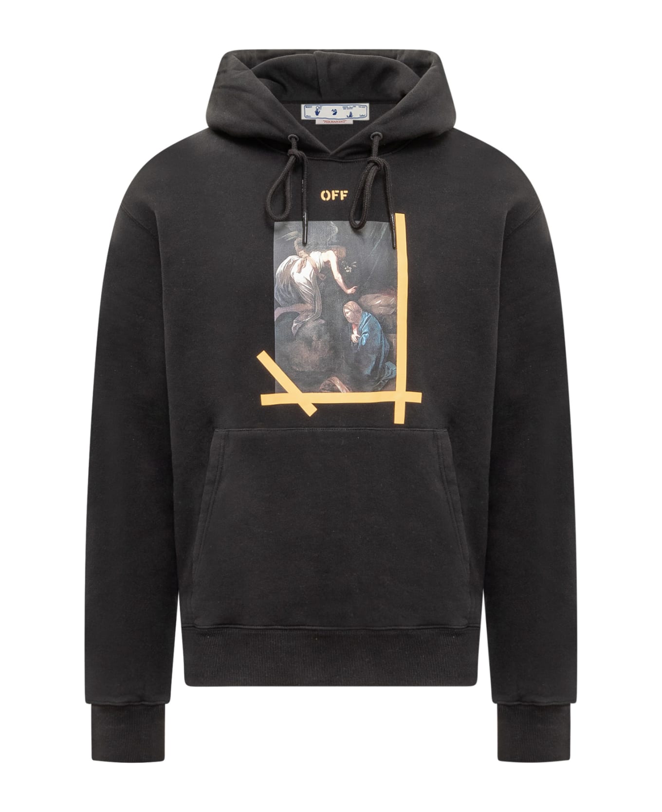Hood with drawstring. Ribbed hem and cuffs. Single pocket on the front. Caravaggio print on the front. Back arrow print. Black color.