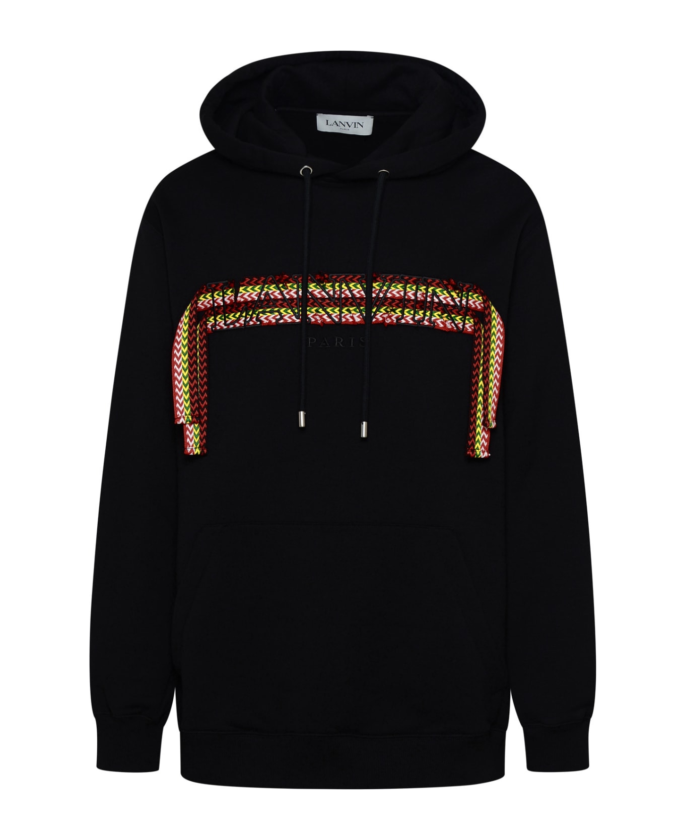 Drawstring hood, embroidered LANVIN logo with Curb lace detail on the chest, front pouch pocket, and ribbed cuffs and hem