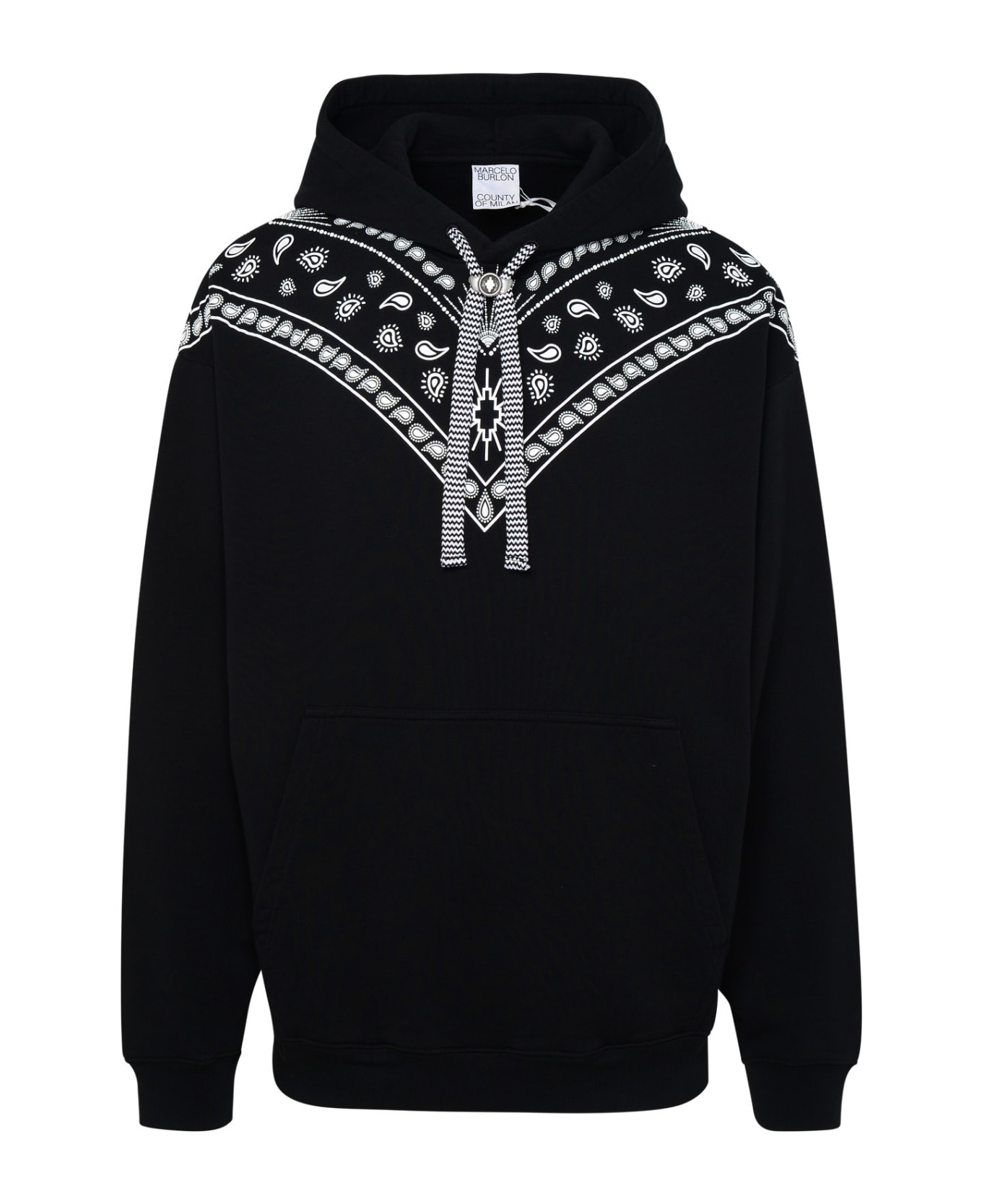 Drawstring hood, bandana print on the shoulders, front kangaroo pocket, ribbed cuffs and hem