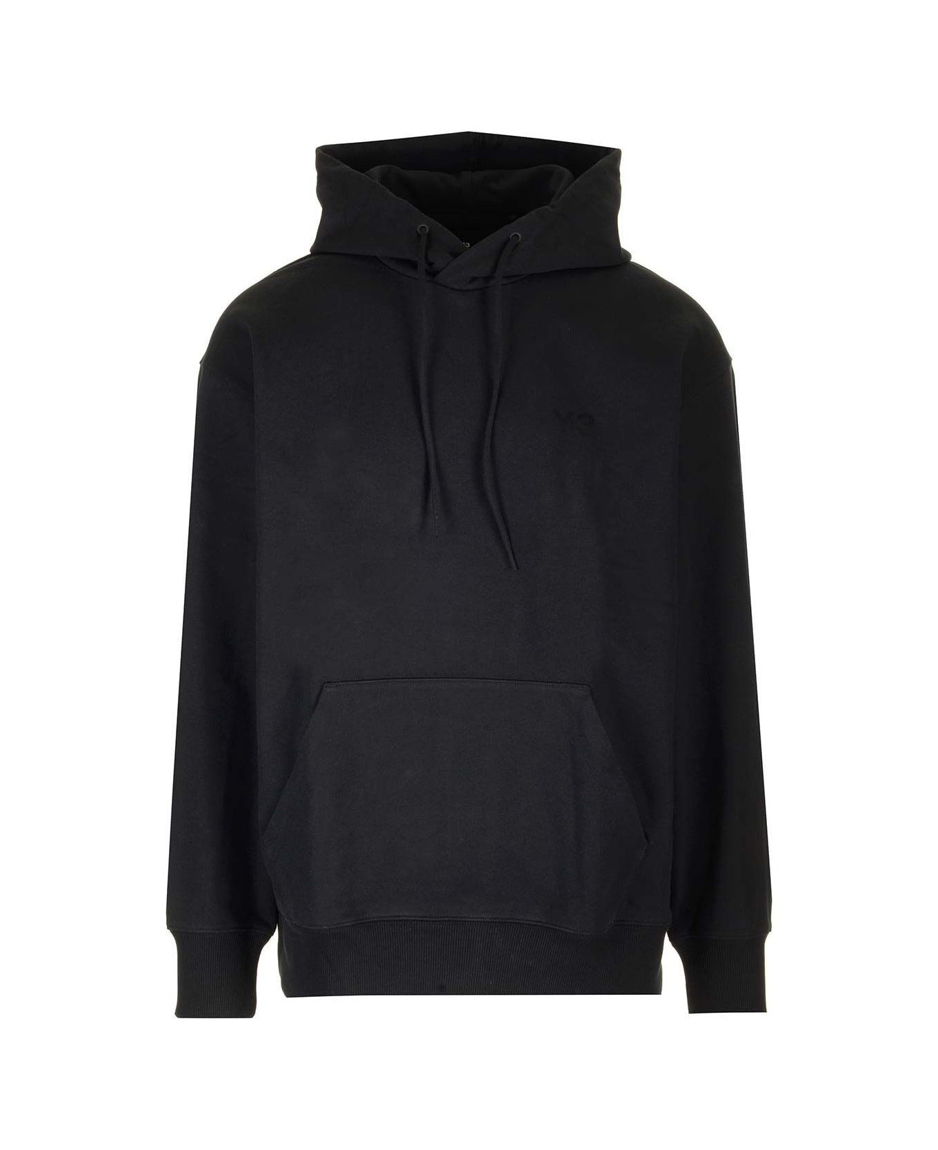 Black "French Terry" hoodie from Adidas Y-3 in cotton blend, casual cut and a loose fit, hood with drawstring, kangaroo pocket with internal phone pocket, ribbed hems, Y-3 logo printed in tone on one side of the chest.