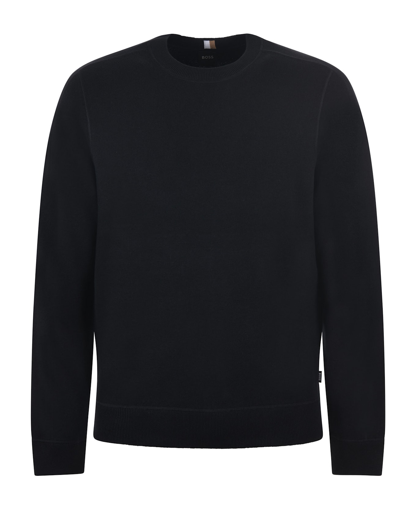 Boss sweater in black cotton and wool blend. Sweatshirt model. Ribbed crew neck. Long sleeve. Ribbed cuffs and bottom. Measurement in photo S 70% cotton, 30% virgin wool