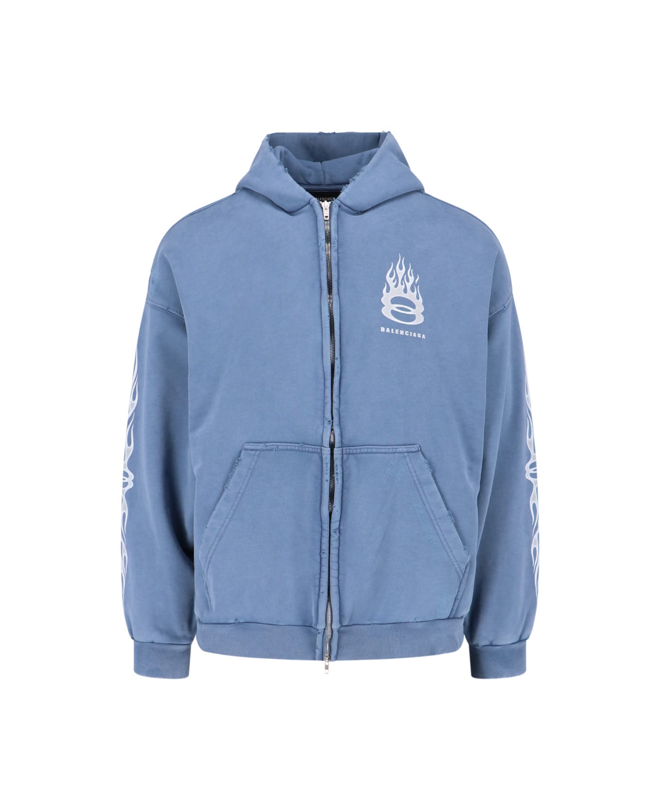 Balenciaga "Burning Unity" light blue cotton hoodie with distressed wash, all-over destroyed details, double zip closure, usured silver logo print on the side and back chest, two flat front pockets, ribbed trim, straight hem.