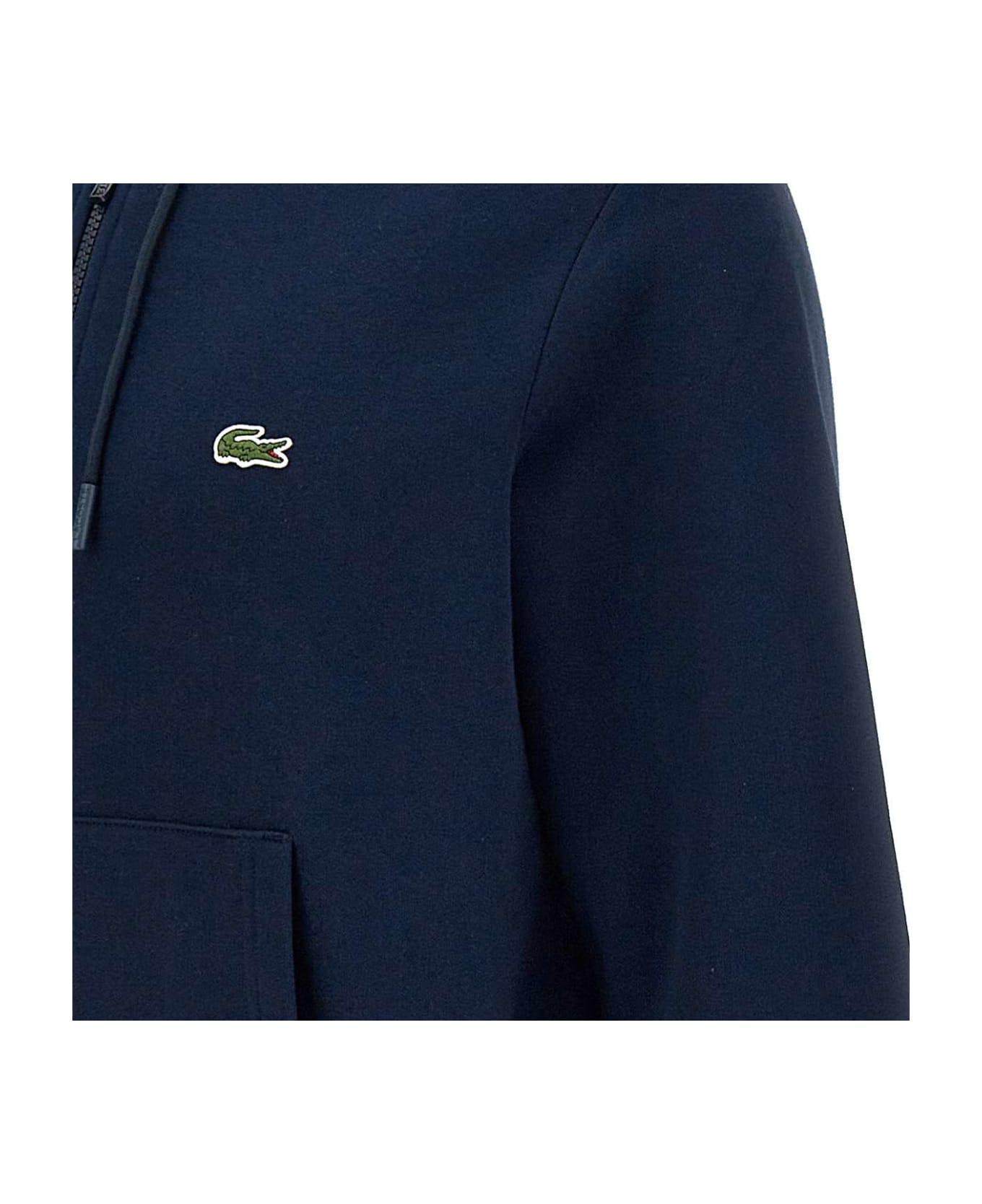 Lacoste men's organic cotton sweatshirt, blue color, hood with matching drawstring, front zip fastening, iconic crocodile logo patch on chest, two side slit pockets, ideal for autumn and winter season. Regular fit