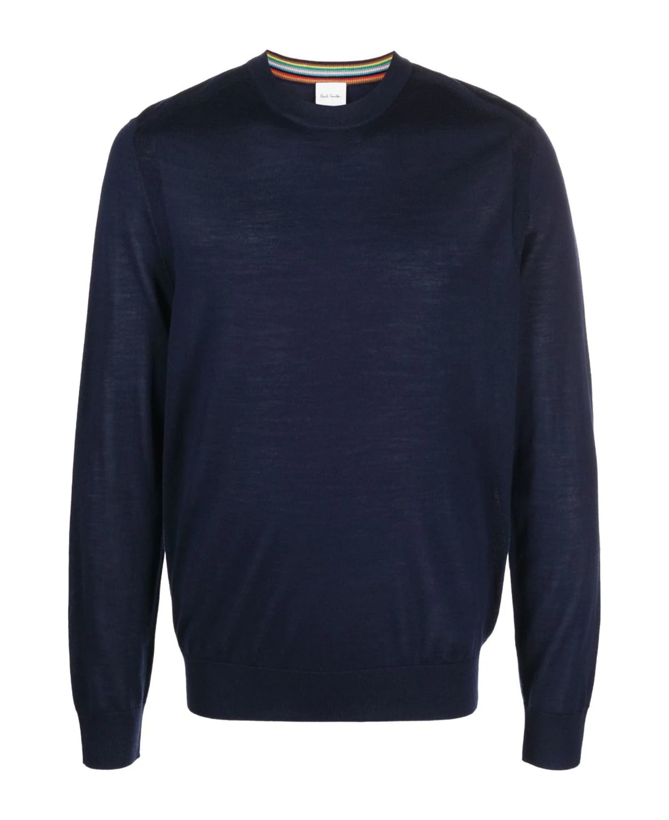 Dark blue merino wool jumper, fine knit, ribbed trim, crew neck, long sleeves, straight hem Composition: Wool, 100%