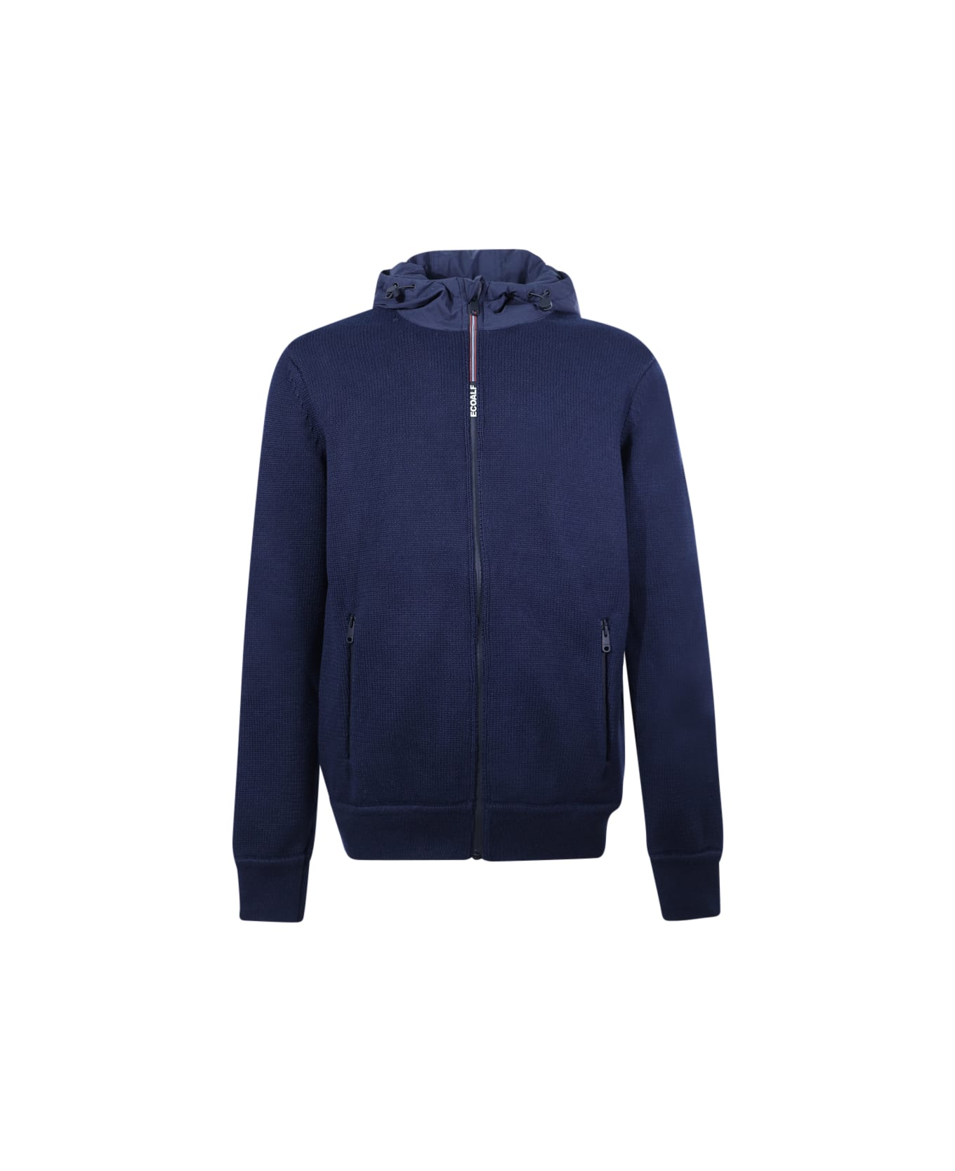Zip closure, fixed hood with drawstring, side pockets with zip, logo patch on left sleeve, stockinette stitch. Blue color. Composition: 100% Polyester (Recycled).