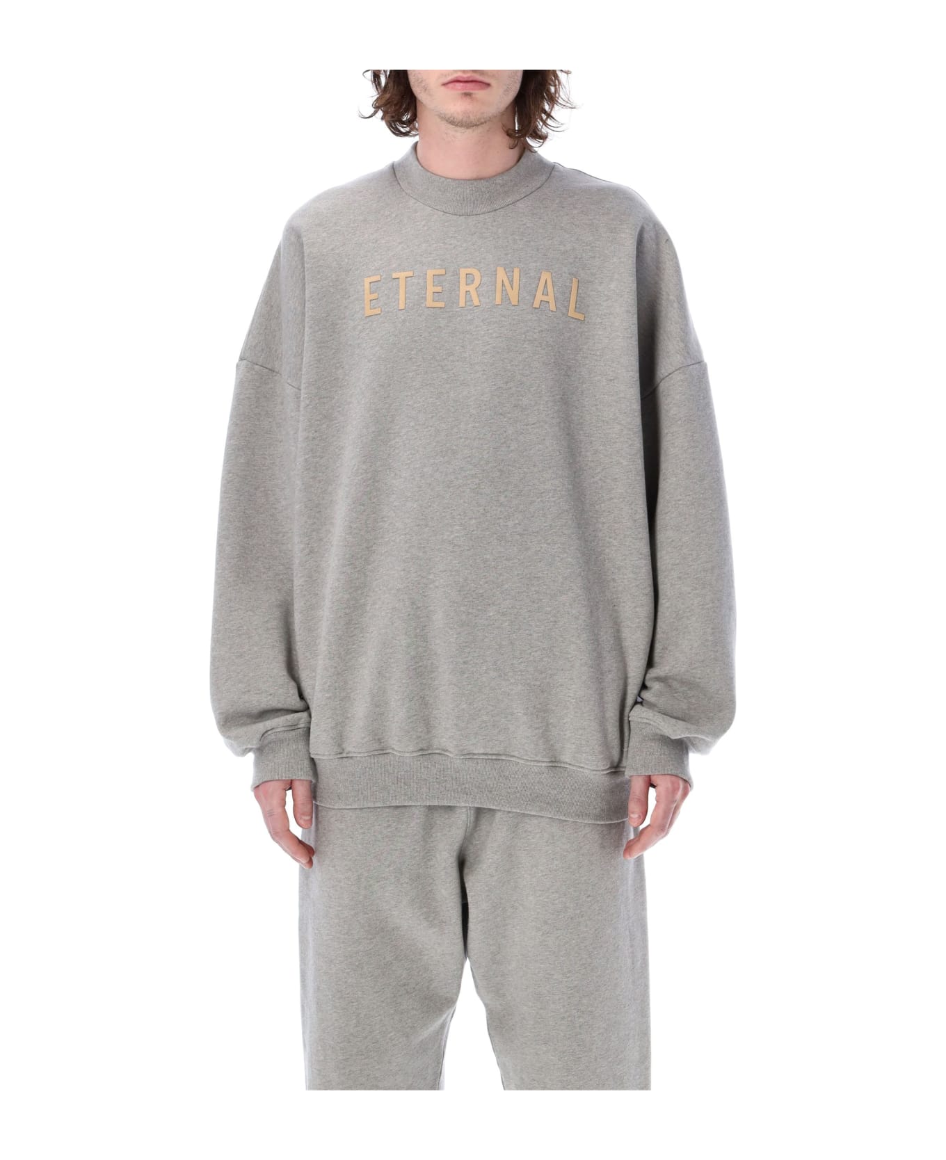 Cotton Eternal Fleece Crewneck By Fear Of God. Featuring: Wide Ribbed Crewneck Flocked Eternal Print At Front Drop Shoulder Fear Of God Leather Patch At Rear Collar Ribbed Cuffs And Hem Model Is 1,90 M Tall And He Is Wearing Size L