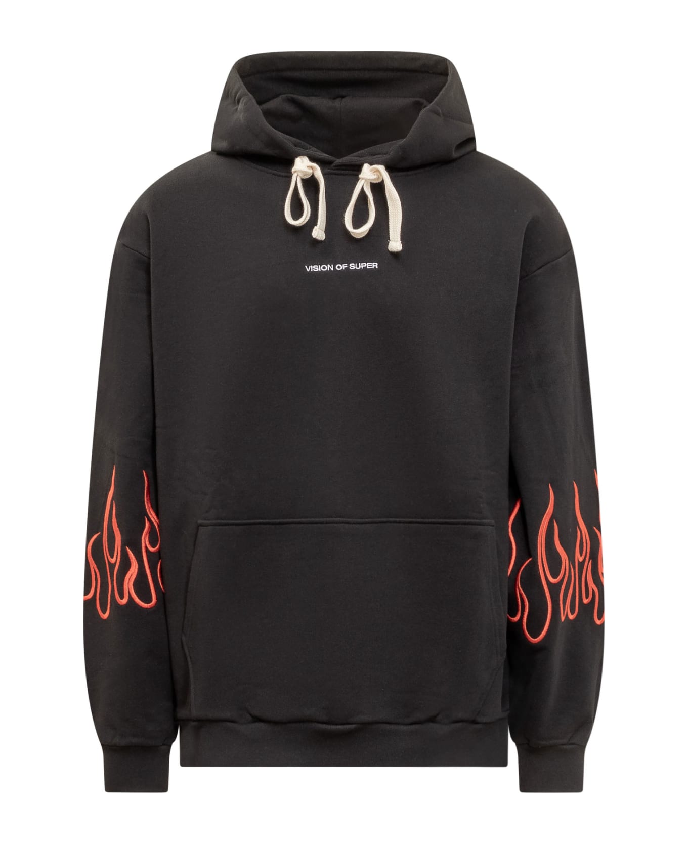 Black long sleeve sweatshirt. Drawstring hood. Embroidered logo on the front. Front pocket. Ribbed cuffs and bottom. Flamed embroidery on the sleeves.