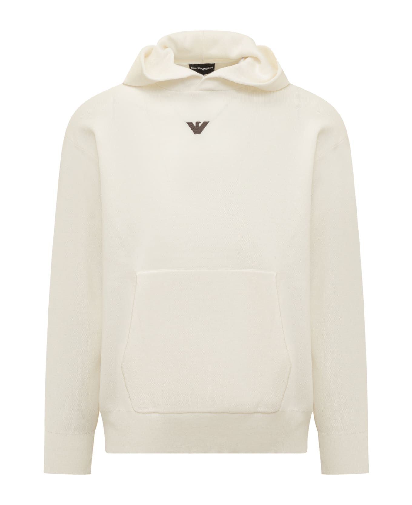 White long-sleeved shirt. Hood. Logo on the front. Front pocket. Ribbed cuffs and bottom. Composition: 43% Acrylic, 41% Virgin Wool, 16% Cotton