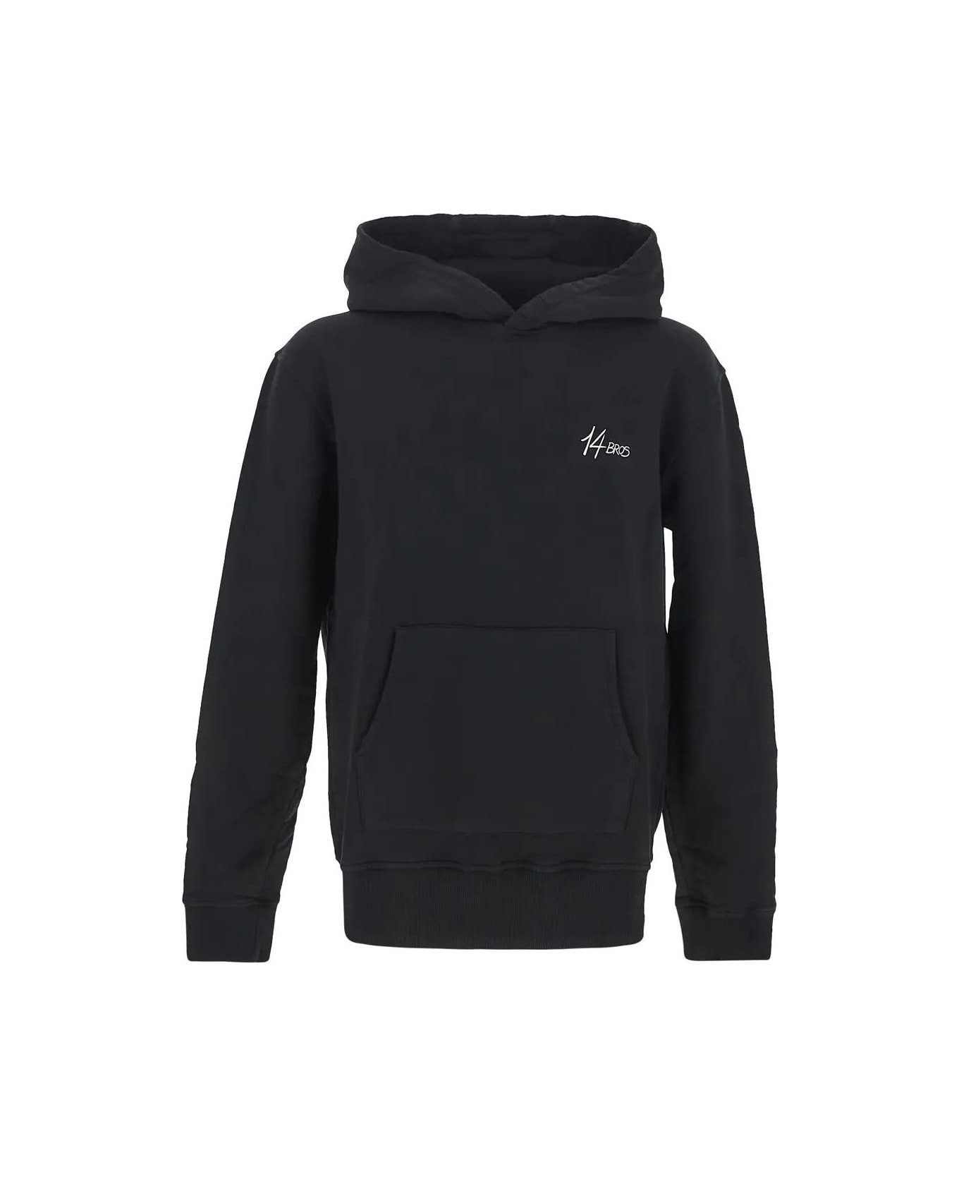 14 Bros hooded sweatshirts in black cotton with ruined details, white logo printed on the chest and on the back, kangaroo pocket on the front, ribbed elastic ribbed cuffs and waist.