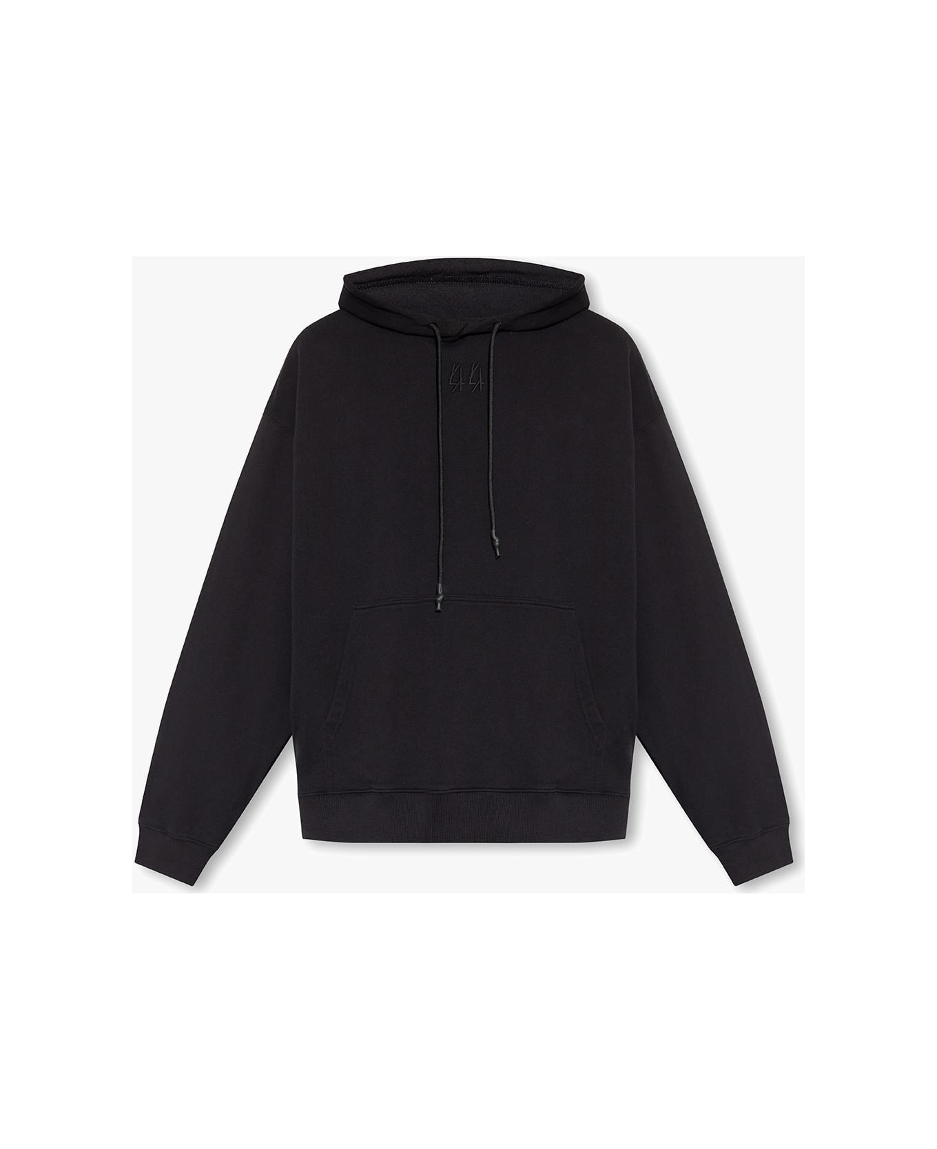 Black sweatshirt with a drawcord-adjustable hood from 44 Label Group. Crafted from cotton jersey, this style features an embroidered black logo, two slip pockets, a cream graphic print at the back and ribbed trims on the edges.