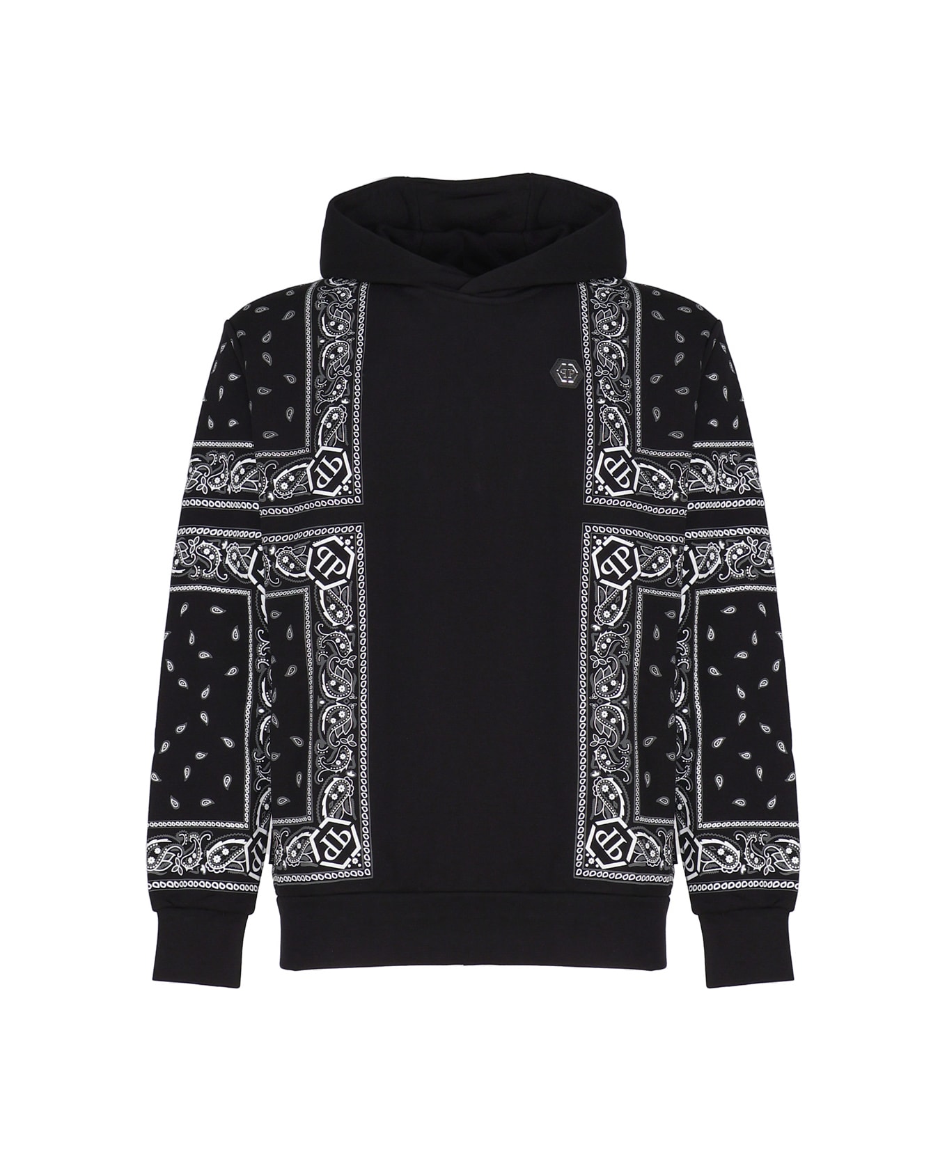 Black Hoodie from Philipp Plein -Paisley print -Bandana print -Front application with logo -Wide hood -Long sleeves -Straight hem -Colour: Black -95% Poliestere, 5% Elastan