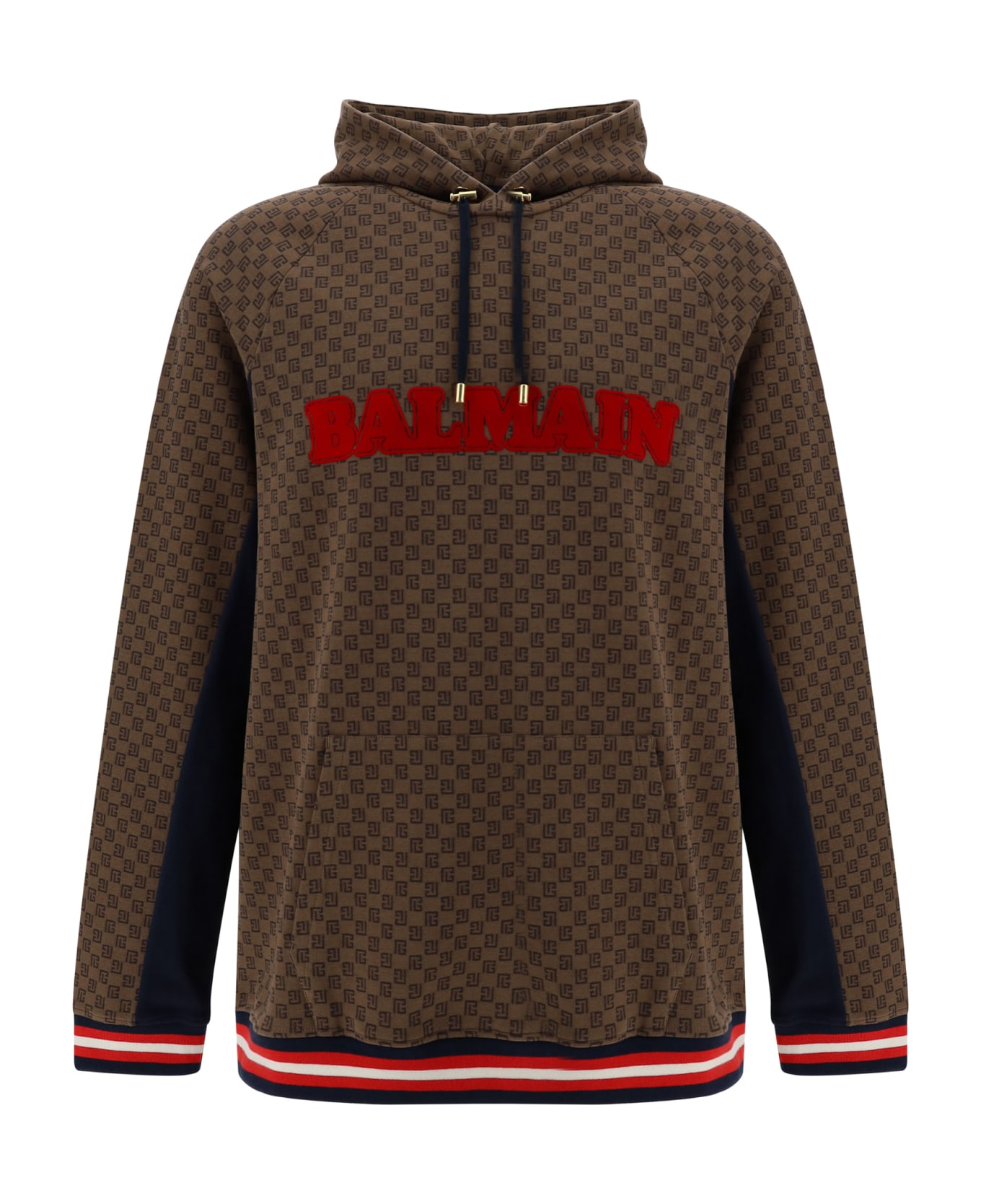 Cotton hoodie by balmain, drawstring-adjustable hood, iconic brand monogram applied in contrast on front, ribbed cuffs, front kangaroo pocket, ribbed hem, all-over geometric pattern, regular fit.