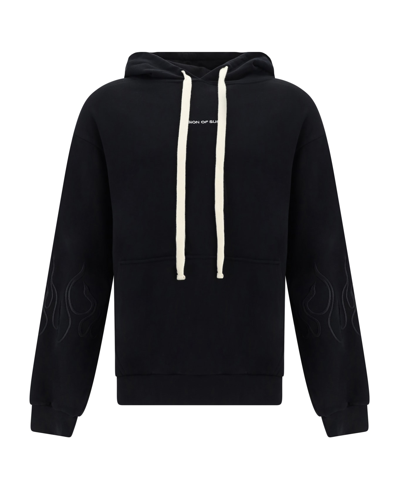 Cotton hoodie by vision of super, hood with adjustable drawstring, ribbed cuffs, ribbed hem, front kangaroo pocket, graphics with iconic brand flames printed in contrast on arms, regular fit.