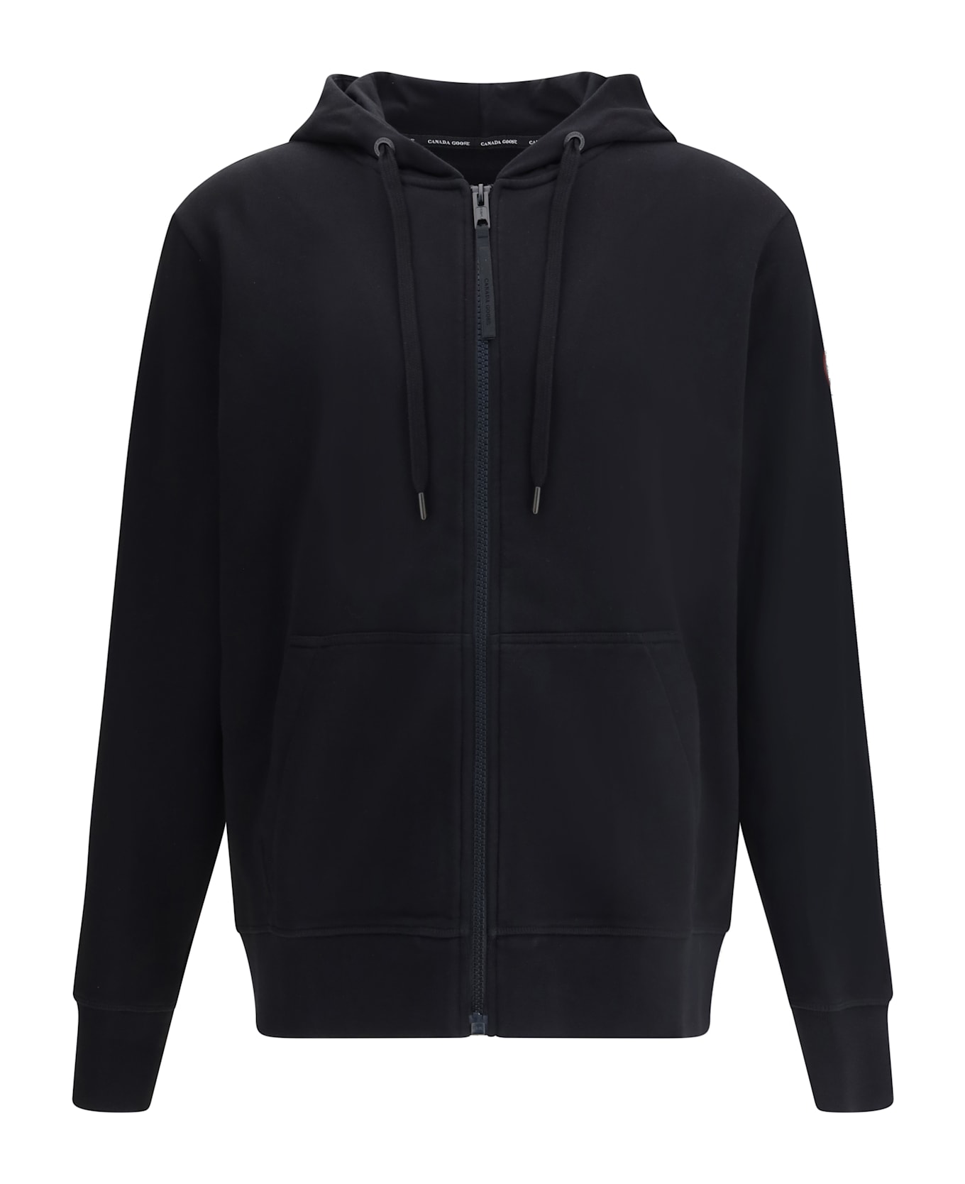 Canada goose's huron hoodie made of soft cotton features an adjustable drawstring hood and front zipper closure. the clean design is complemented by two welt pockets on the front, ribbed cuffs and hem for a comfortable fit. the brand's iconic logo patch is sewn on one sleeve. monochrome pattern and regular fit for an essential and versatile style. Composition: 100% % Cotton