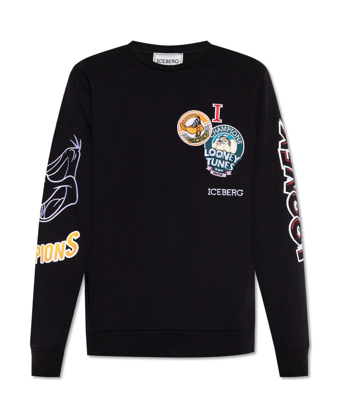 Black sweatshirt from Iceberg x Looney Tunes. Made of cotton, this design features multicolored patches, a printed pattern, logo, round neck, long sleeves and ribbed edges. Composition: 100% Cotton