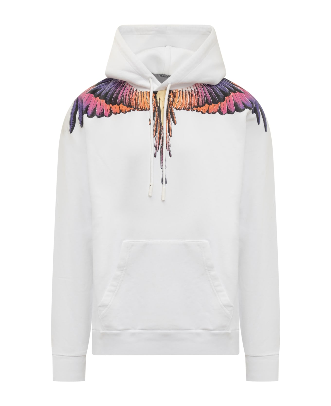 White long sleeve sweatshirt. Drawstring hood. Front pocket. Wings printed on the shoulders. Ribbed cuffs and bottom.