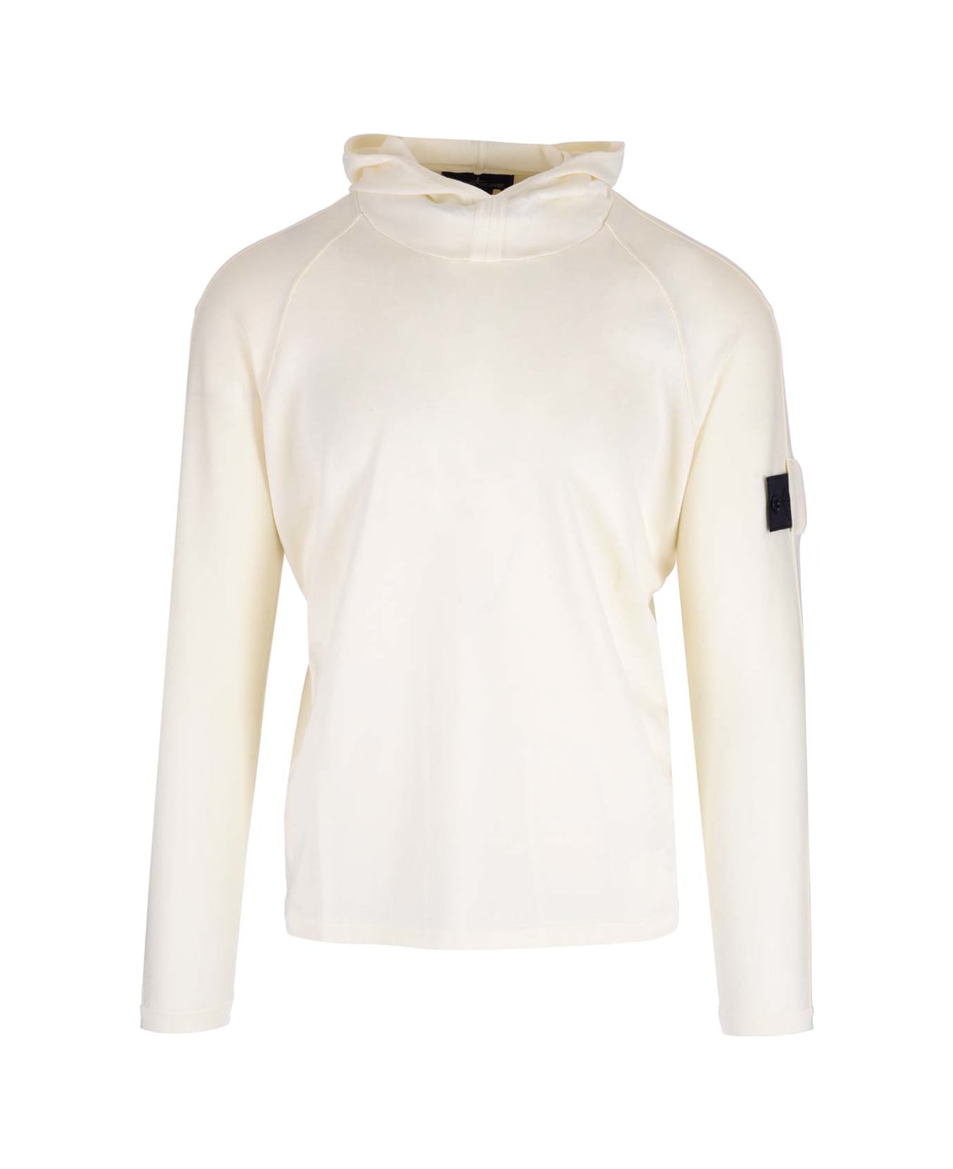 Ivory sweater with hood from Stone Island from the Shadow Project collection in cotton, long sleeves, tag on one arm.