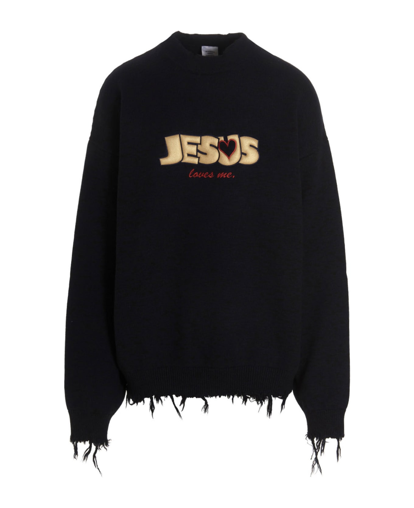 'Jesus Loves' merino wool sweater with embroidery at the front and back, crew neck, long cuffed sleeves, frayed trims. g. Composition: 100% merino wool