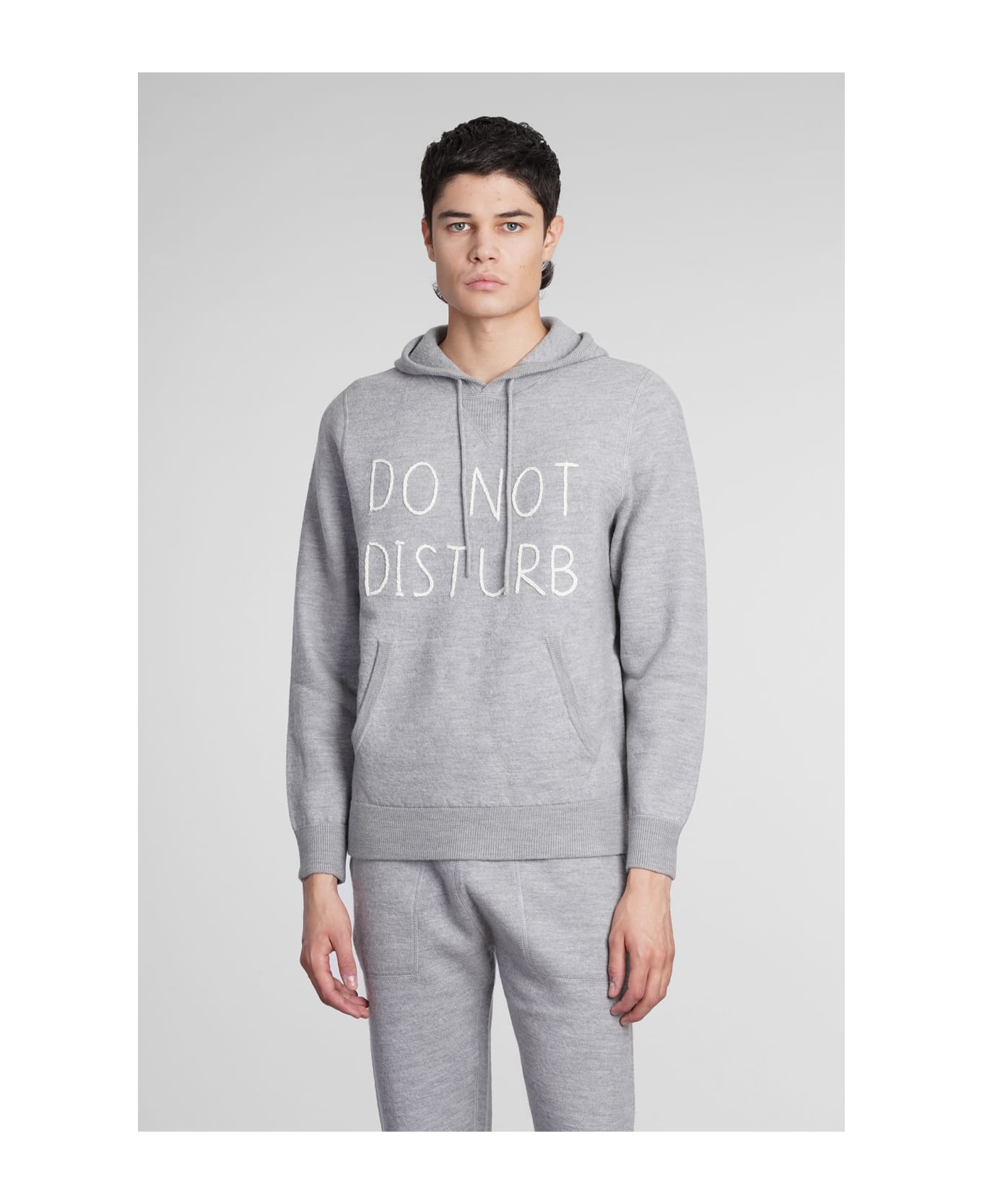 Knitwear in grey wool, adjustable hood with laces, long sleeves, ribbed cuffs and bottom, kangaroo pockets, embroidery logo, 100% wool, Made in China, Model is 1. 83 and wears size M