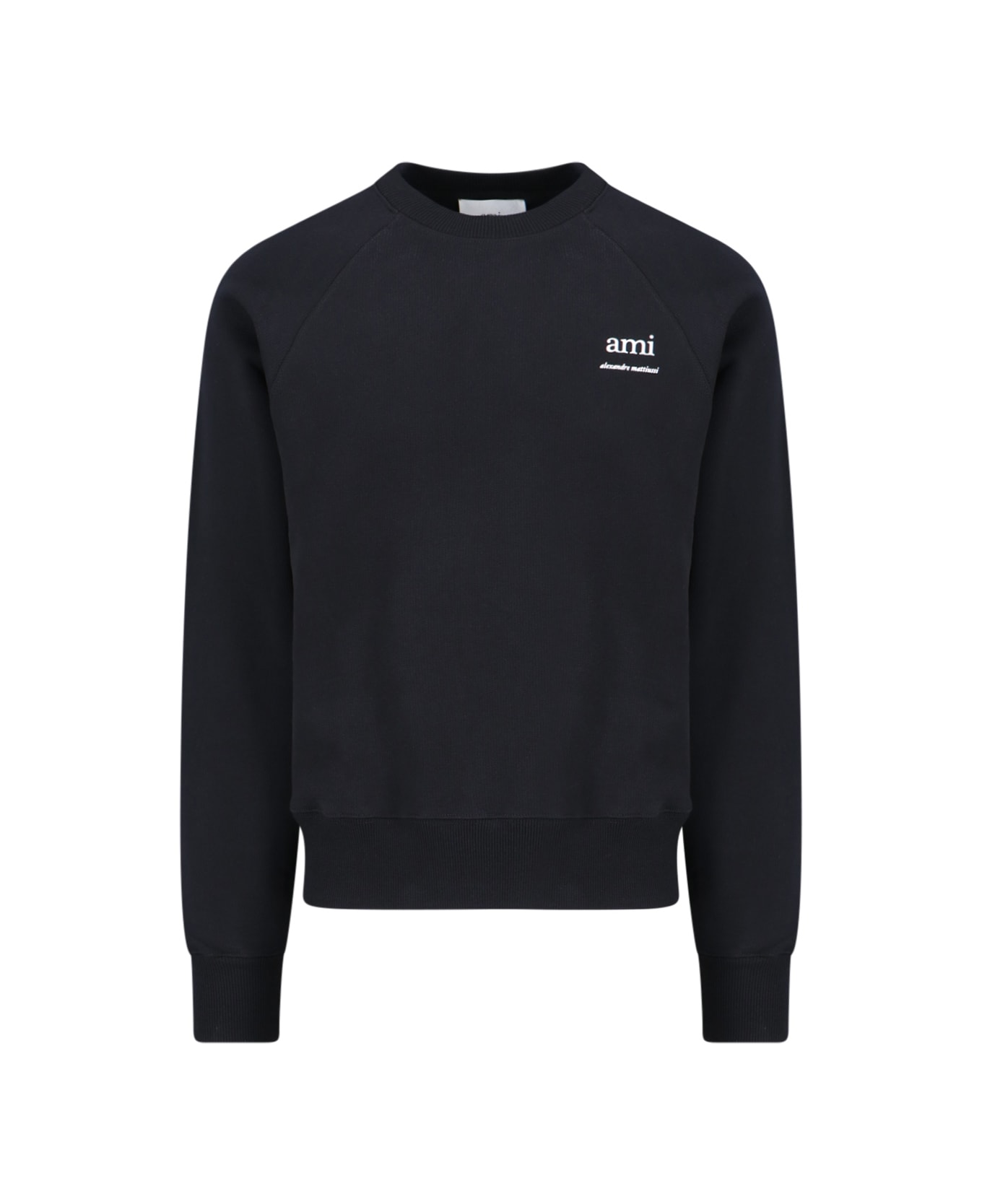 Ami crew neck sweatshirt in black cotton blend with white logo print on the front, ribbed trims, straight hem. Composition: 99% Cotton, 1% Elastane