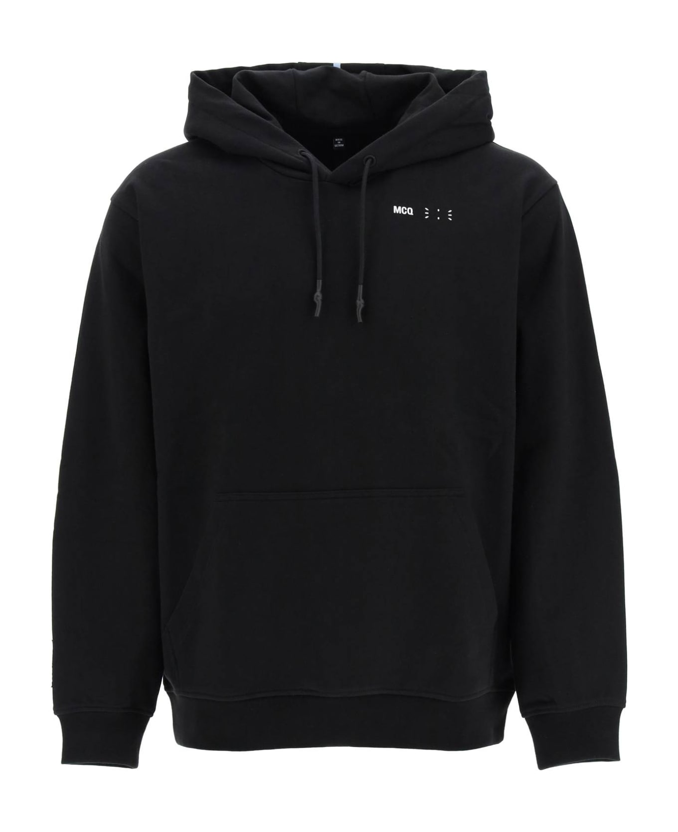 McQ loose hoodie in loop-back cotton jersey, with contrasting mini logo print at front and rear tonal lettering print. Drawstring hood and iconic contrasting loop tab, kangaroo pocket and ribbed edges. The model is 187 cm tall and wears a size L.