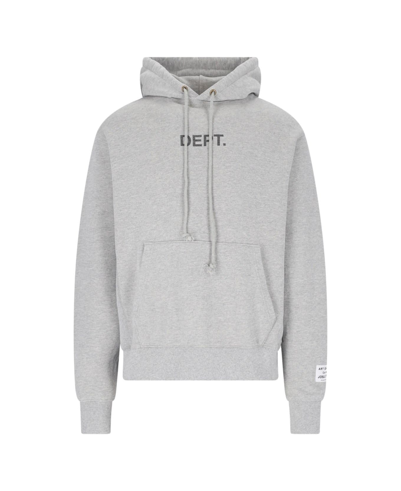 Gallery Dept. logo hoodie, gray cotton, drawstring, 'DEPT' logo print front and back, one front maxi pocket, white logo sleeve label, ribbed trim, straight hem.