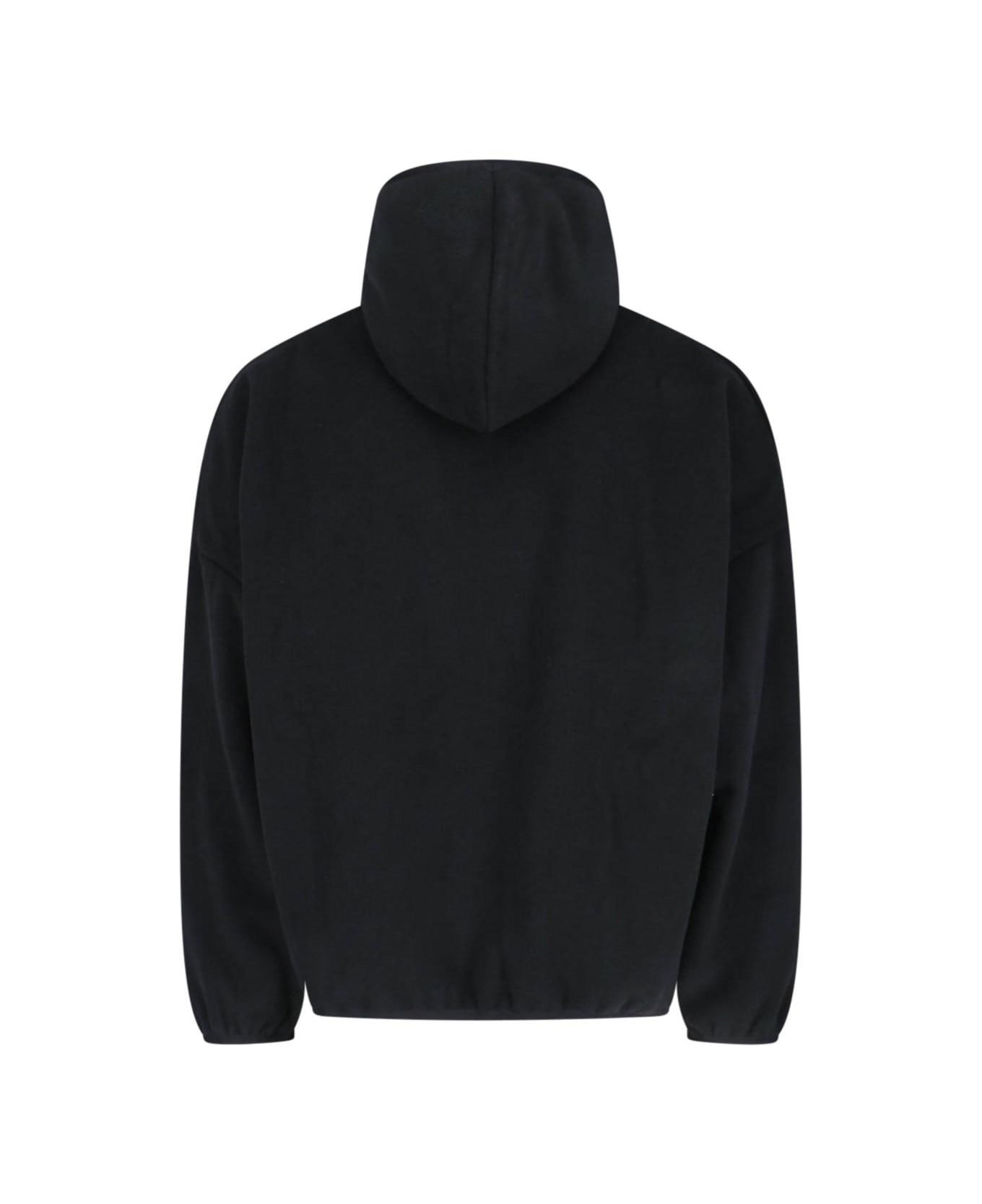 Fear Of God Essentials logo hoodie in black fabric with high neck, contrasting logo print on the front, tone-on-tone logo patch on the sleeve, straight hem.