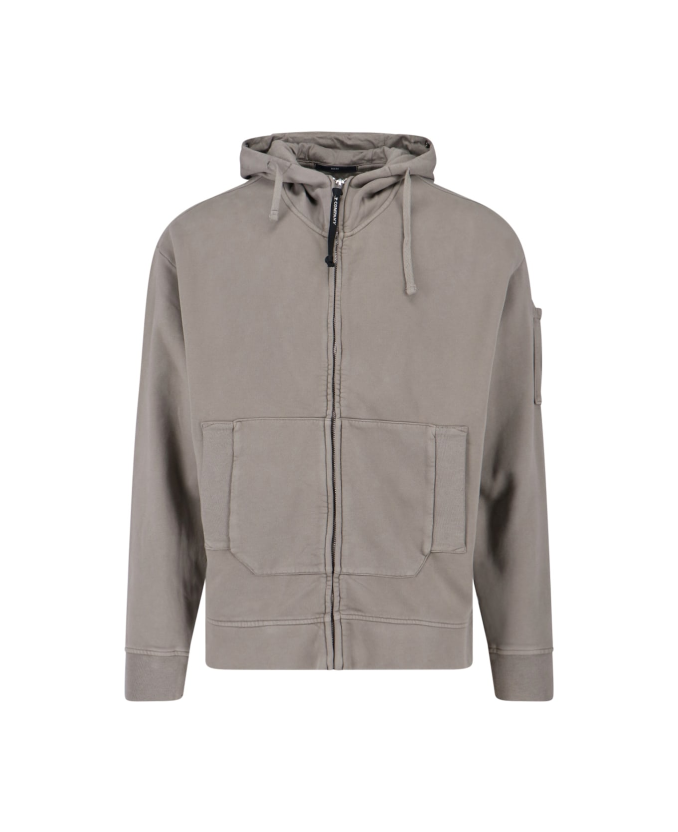 C. P. Company logo hoodie in gray cotton with drawstring hood, hooded glasses detail, zip closure, flap pocket on the sleeve, logo hardware detail on the sleeve, two front pockets, elastic cuffs, straight hem.