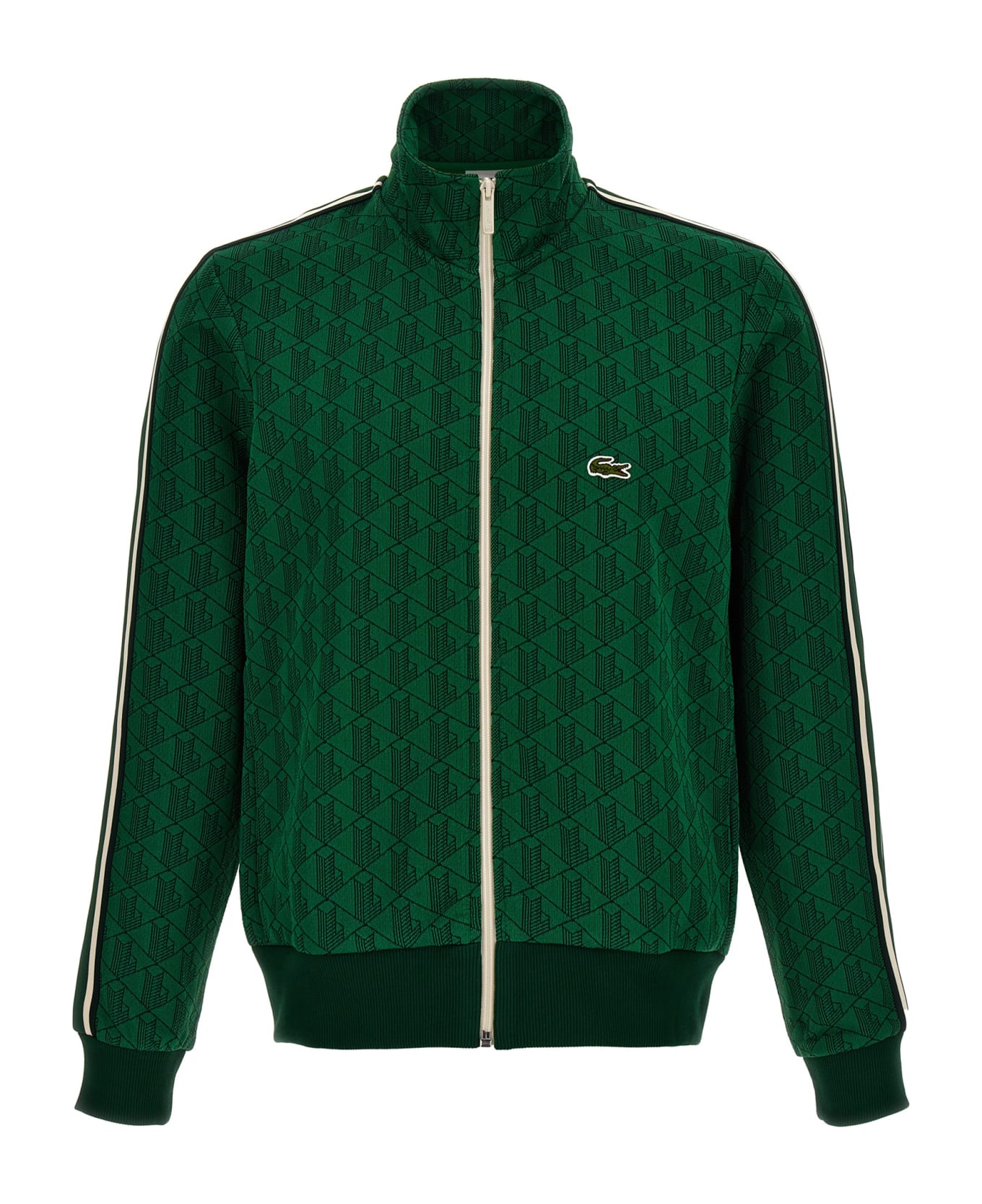 Jaquard fabric sweatshirt with all-over pattern, full zip closure, logo patch, side contrast bands.