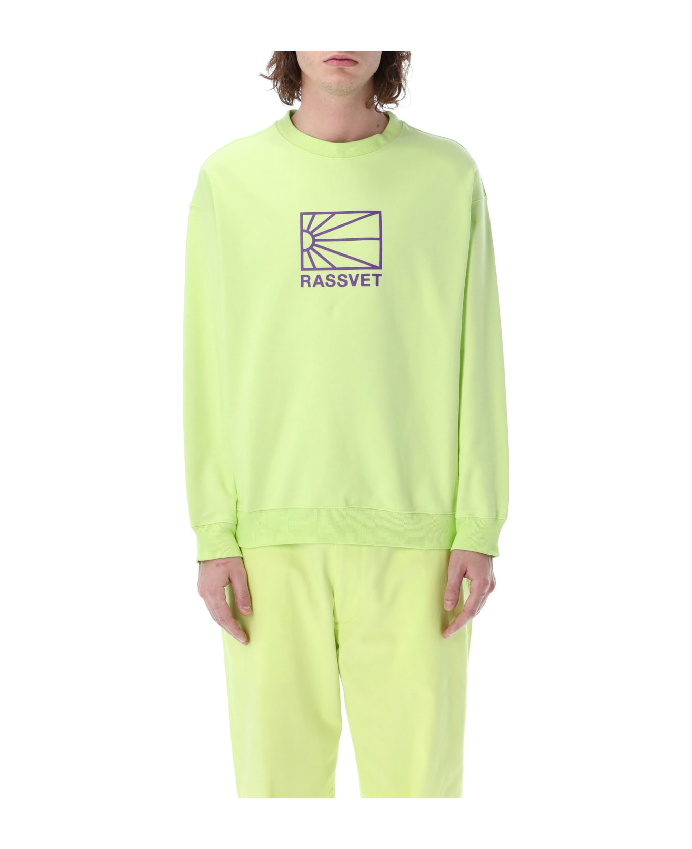 Cotton Logo Print Crewneck By Rassvet. Featuring: Ribbed Crewneck Drop Shoulder Contrasting Logo Printed At Front Long Sleeves Ribbed Cuffs And Hem Model Is 1,90 M Tall And He Is Wearing Size L