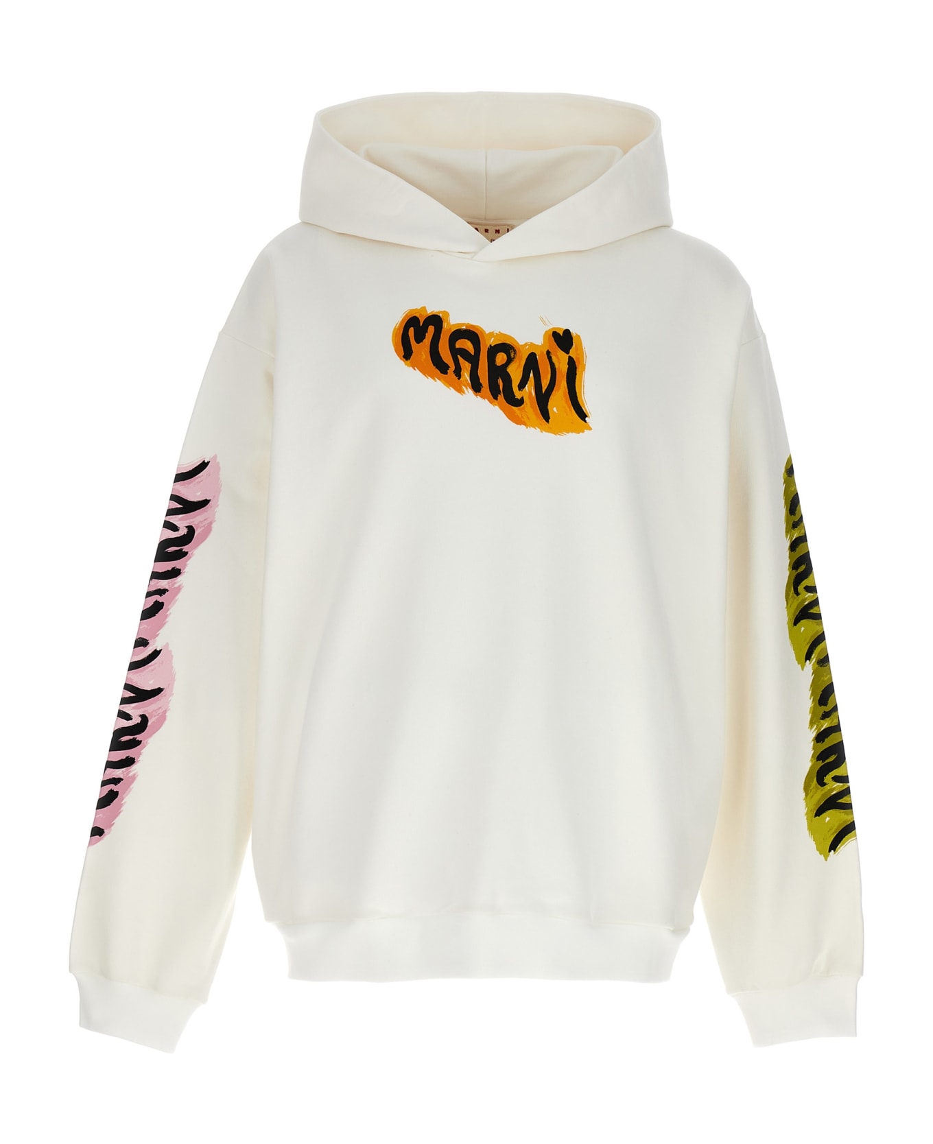 Cotton hoodie with logo print on the front and on sleeves, pockets, long cuffed sleeves. Composition: 100% cotton