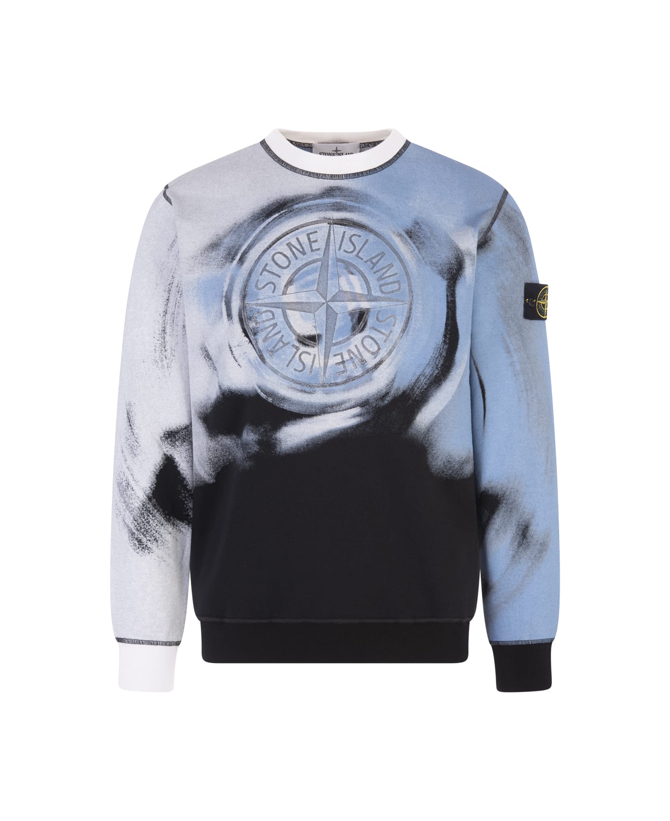 Men's Stone Island sweatshirt made from garment-dyed light blue gauzed cotton and featuring a crew neck, long sleeve, straight hem, ribbed trim, topstitched seams, Motion Saturation print, Stone Island badge on the left sleeve and mixed print techniques on the final garment forming the Stone Island Wind Rose logo on the chest and an all-over brushed rotational pattern.
