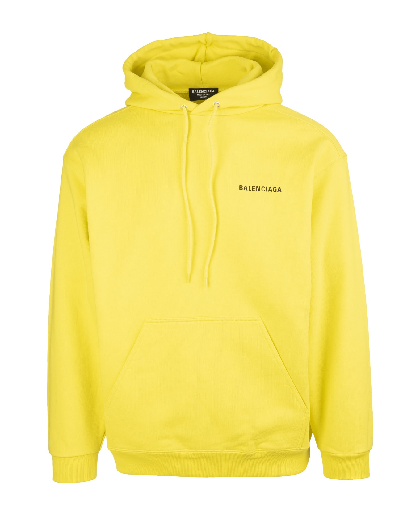 Medium fit hoodie by Balenciaga made of yellow long-haired fleece and featuring hood with drawstring, a kangaroo pocket, long sleeves with low shoulder, elasticated hem and cuffs and black Balenciaga logo printed on the chest and back.