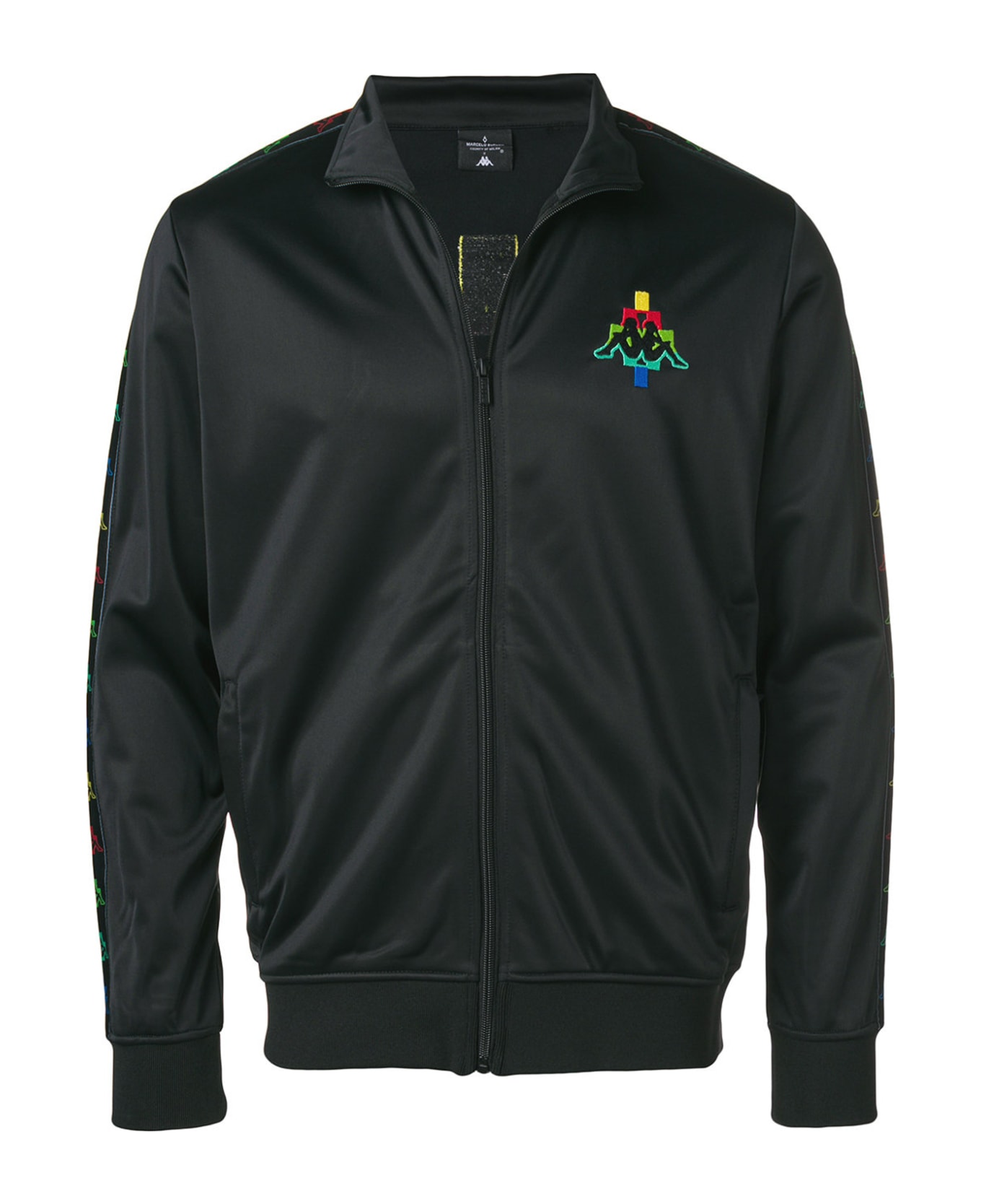 Marcelo Burlon techno jersey jacket from the Kappa collaboration. It has a zip closure, embroidered logo on the chest and back. Iconic band on the sleeves, ribbed cuffs and hem. Regular fit. Model height is 182 cm and he is wearing a size M.