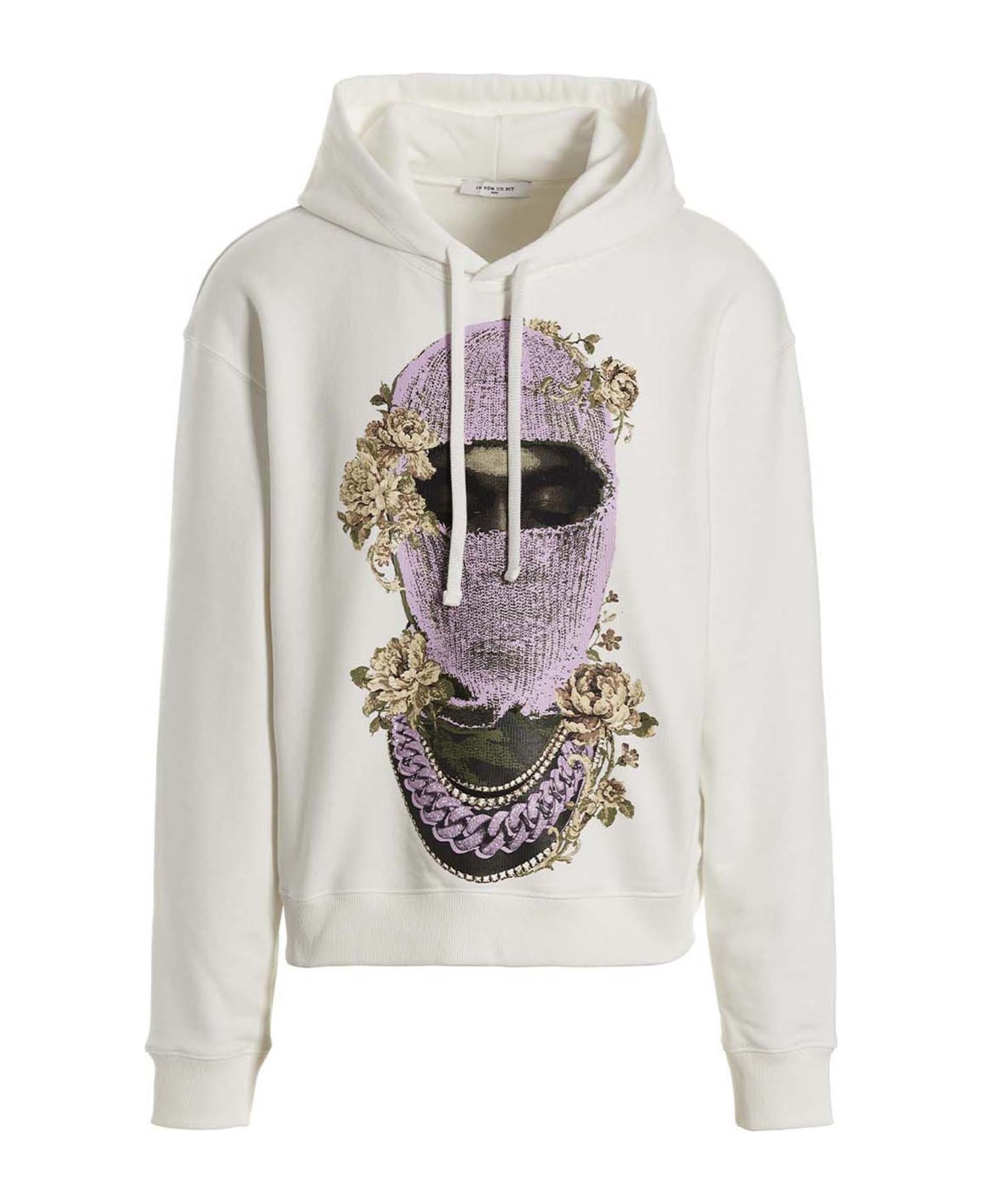 Mask Roses & Logo' cotton hoodie with front print, a logo print at the back, and long cuffed sleeves.