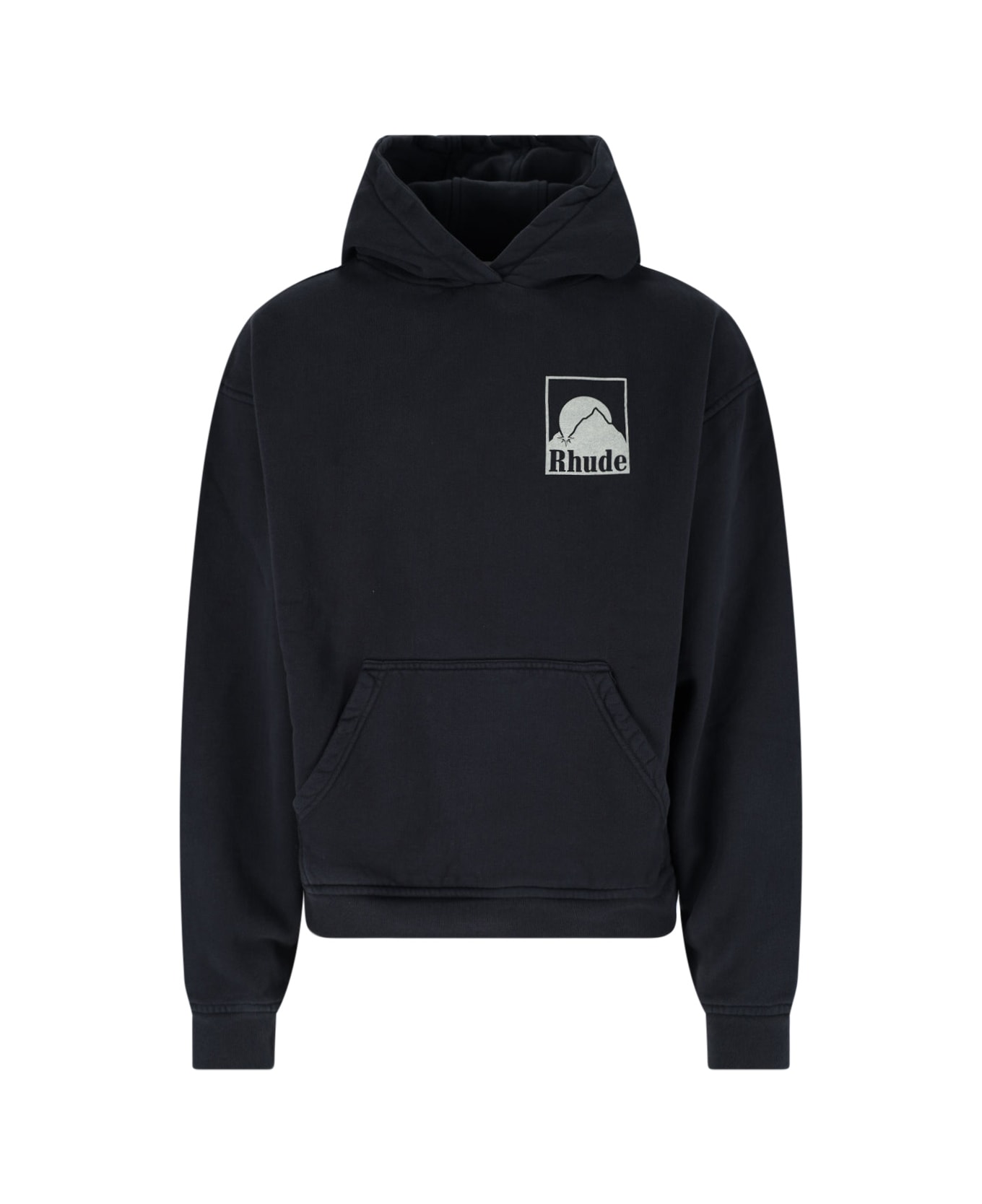 Rhude Moonlight Badge hoodie in black cotton with contrasting logo print on the chest, maxi front pocket, contrasting maxi logo print on the back, ribbed trim, and straight hem.