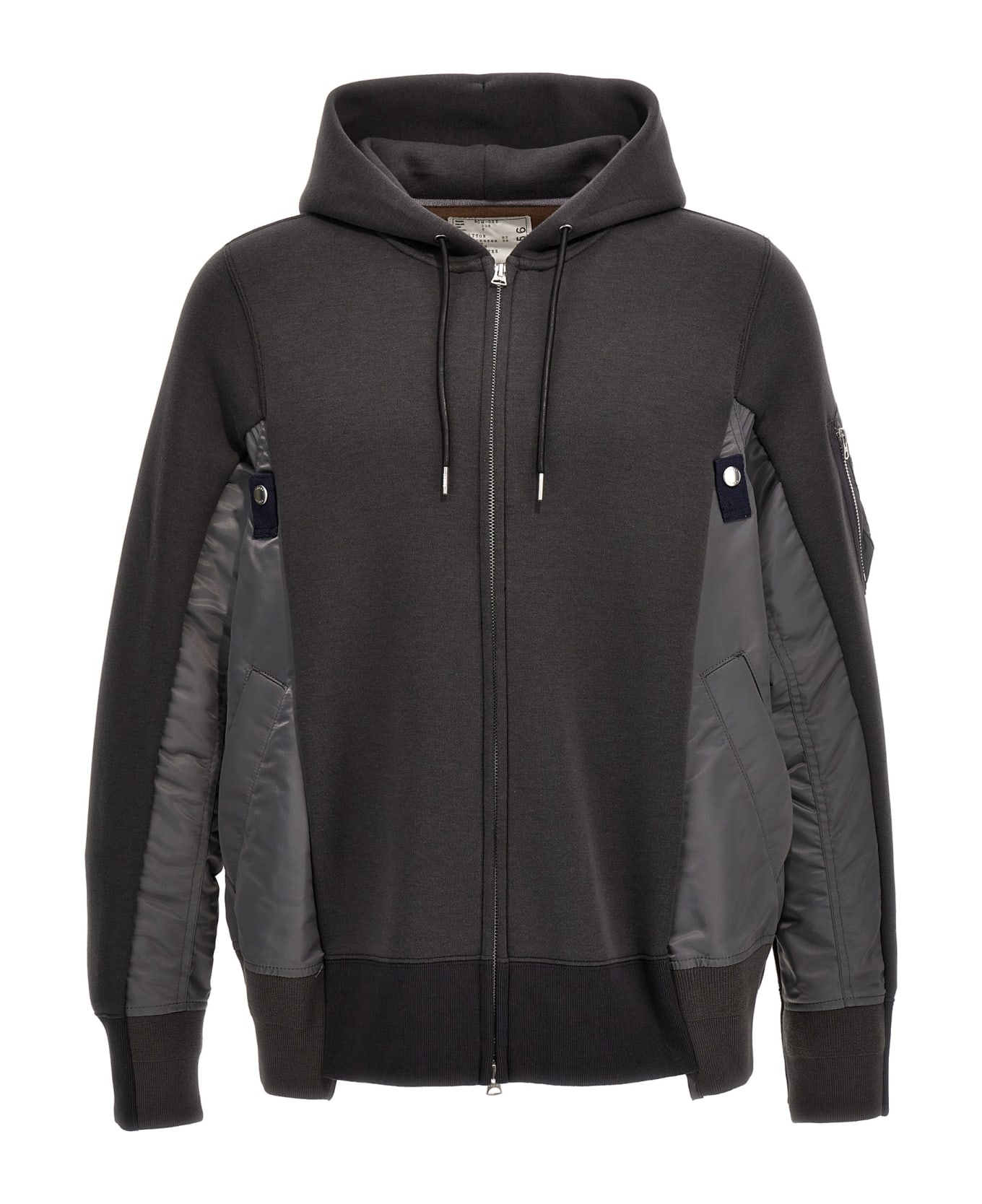 Cotton hoodie with nylon inserts, a zip closure, pockets, and long cuffed sleeves.
