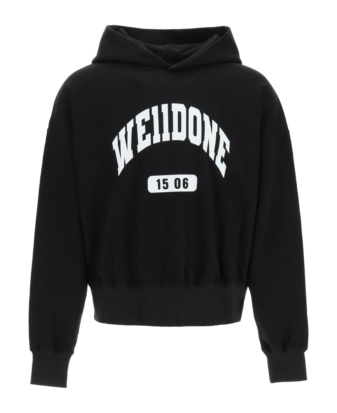 We11done hooded sweatshirt in pure cotton French terry with Old School Campus logo printed on the front and rubber logo tag applied on the lower back. Ribbed stretch cuffs and hem, oversized boxy fit. The model is 187 cm tall and wears a size L.