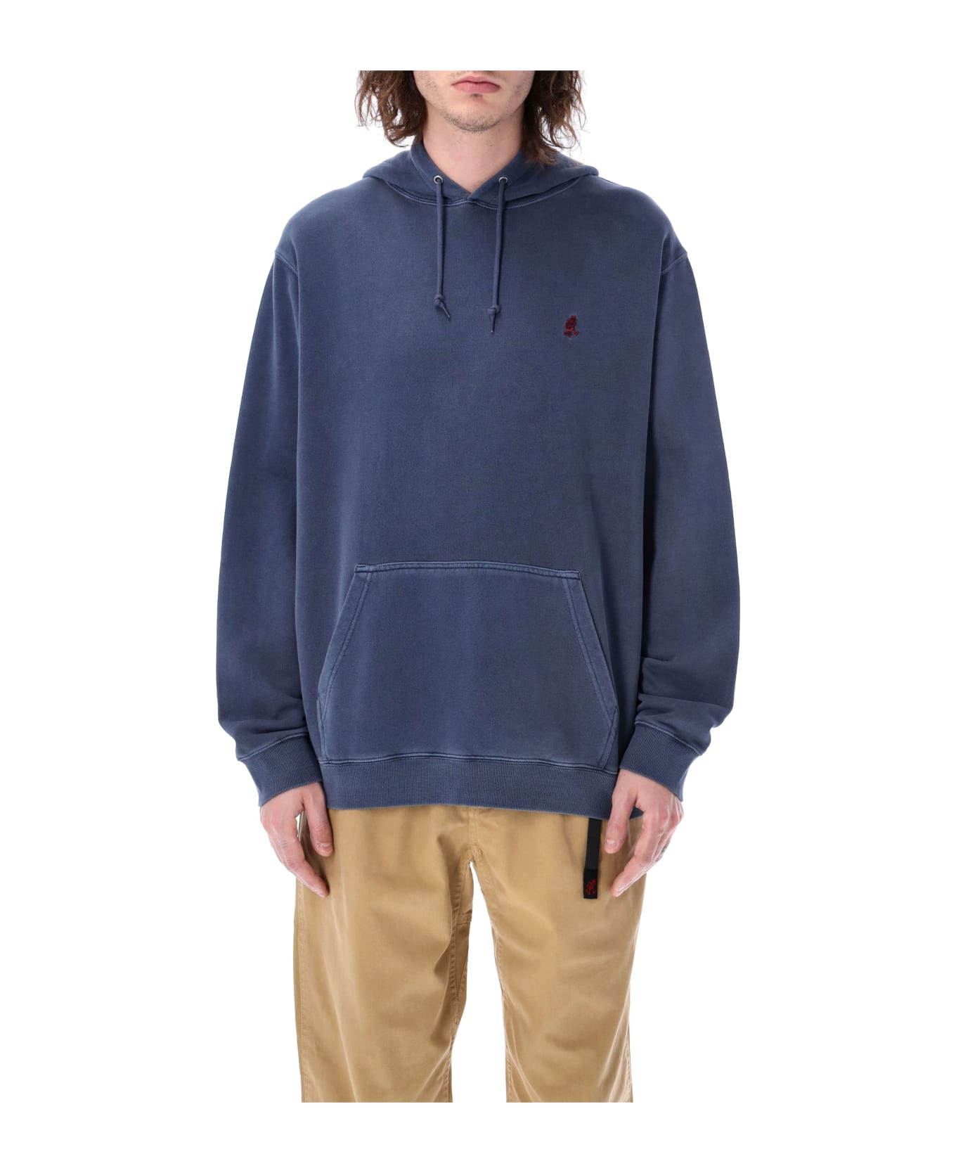 Cotton One Point Hoodie By Gramicci. Featuring: Drawstring Hood Long Sleeves Dropped Shoulders Running Man Icon Embroidered At Chest Kangaroo Pocket Rib Trims The Model Is 1,90 M Tall And He's Wearing Size L