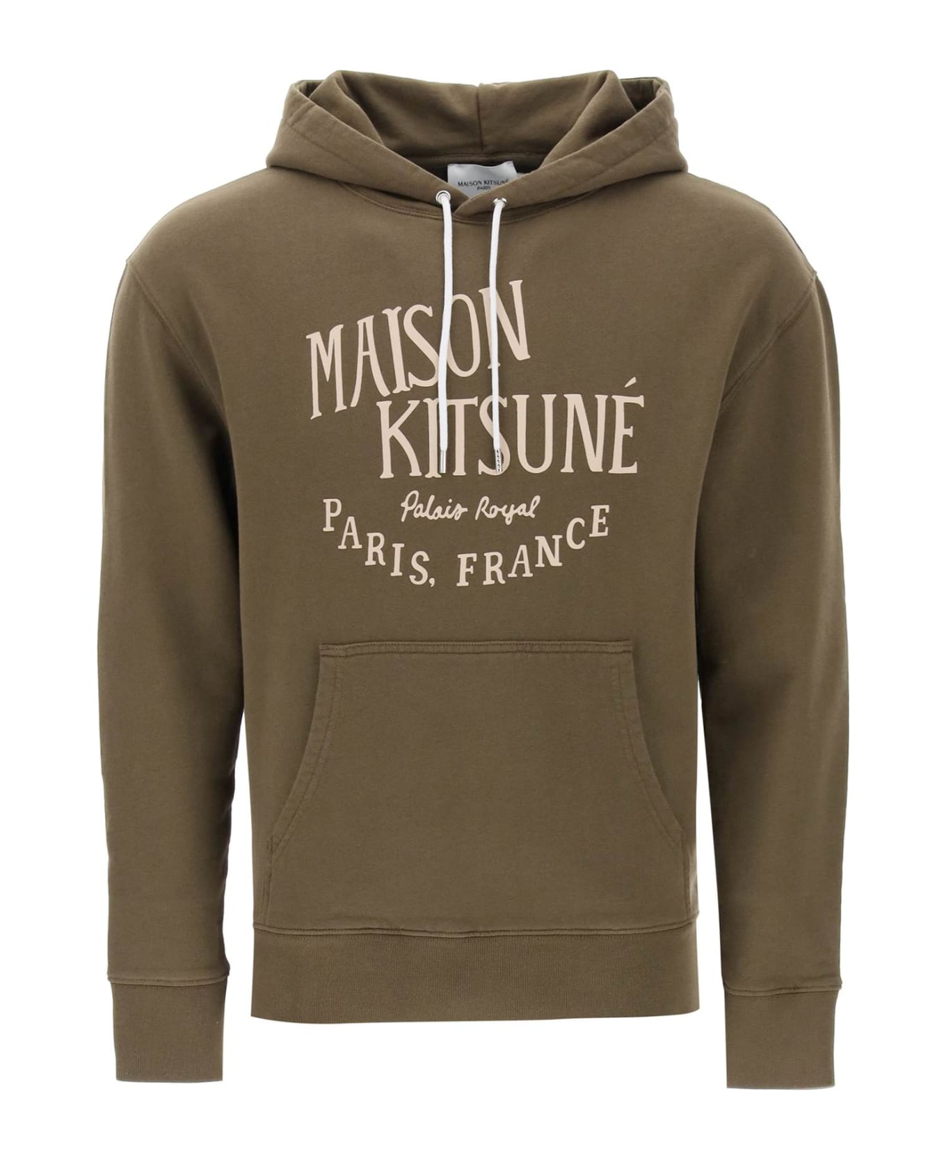 Maison Kitsun ooded sweatshirt showcasing a lettering front print. Made from loop-back mid-weight cotton jersey, it features drawstring hood, kangaroo pocket and ribbed trims. Loose fit with dropped shoulders. The model is 187 cm tall and wears a size L. Composition: 100%CO