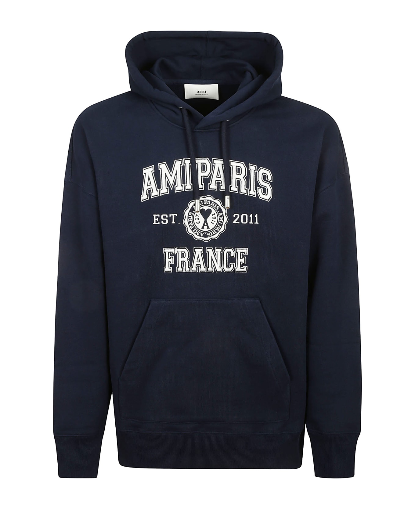 Ami Sweatshirt in blue cotton, hood with drawstring, front logo print, ribbed edges, front pocket. Composition: 100% Cotton