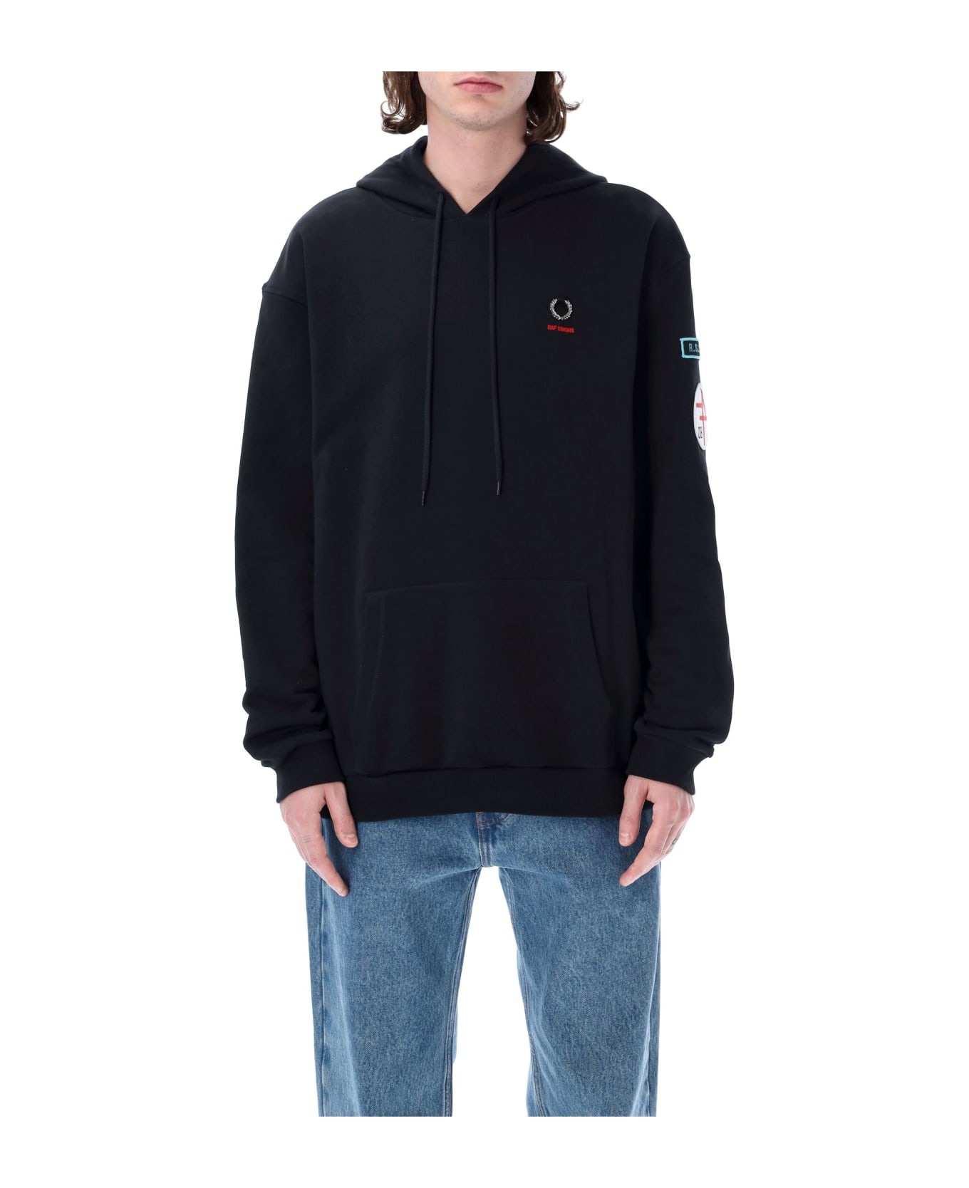 Cotton Patched Overhead Hoody By Fred Perry Raf Simons. Featuring: Drawstring Hood Long Sleeves Dropped Shoulders Red Raf Simons Embroidery At Chest Silver Metal Laurel Wreath At Chest Kangaroo Pocket Embroidered Patches At Left Sleeve Rib Trims Loose Fit The Model Is 1,90 M Tall And He's Wearing Size M