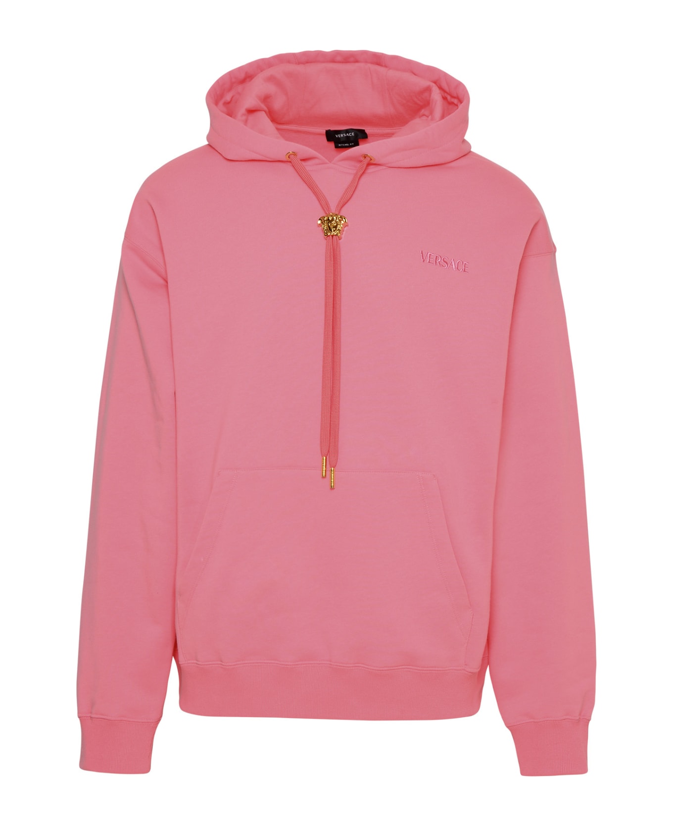 Drawstring hood, metal Medusa on the removable drawstring, embroidered logo on the chest, front pouch pocket, and ribbed cuffs and hem Composition: 100% cotton
