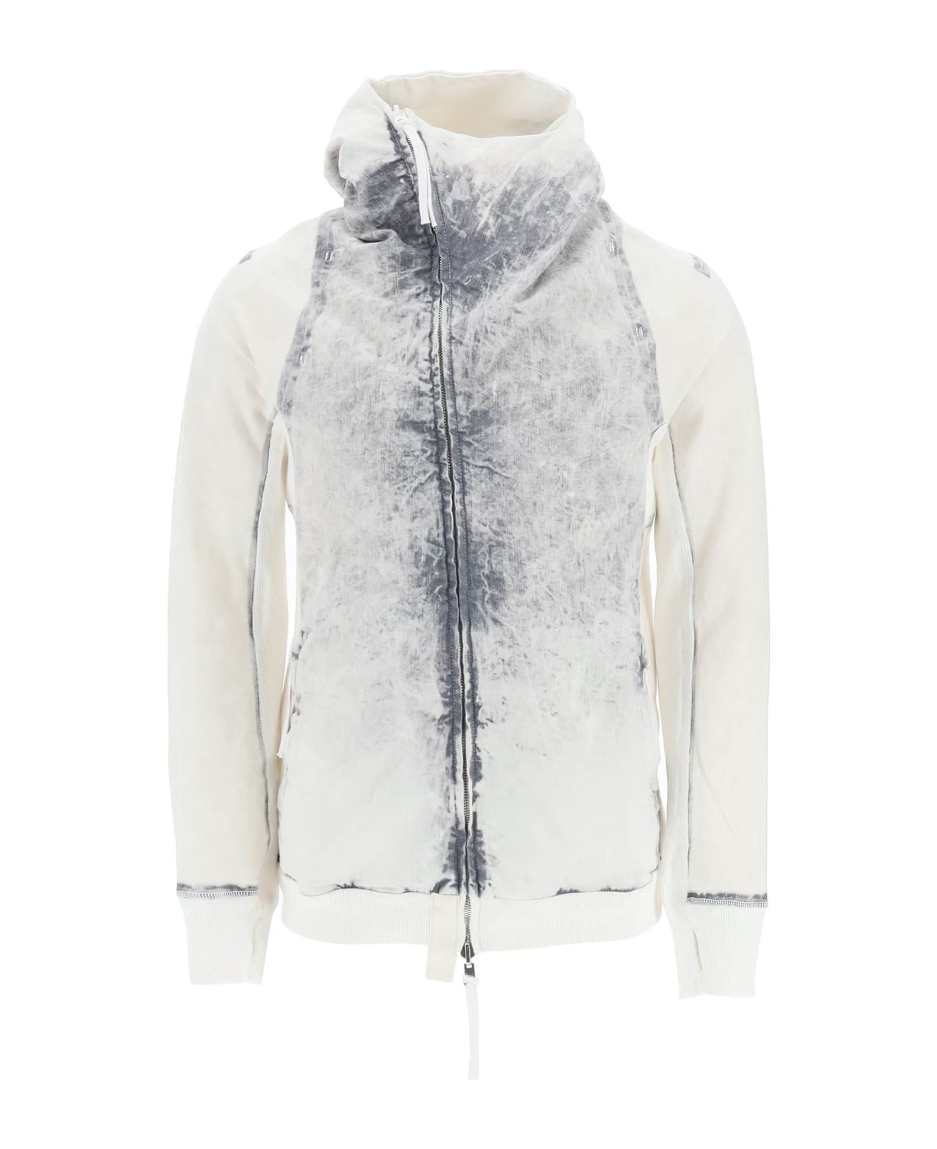 Reversible blouson sweatshirt by Boris Bidjan Saberi, made of acid-dyed stretch denim and compact cotton jersey. It features an asymmetric double-slider zip closure, fixed hood, thumbhole cuffs and internal webbing shoulder straps. it is also provided with zip pockets on the outside and welt pockets on the inside and is finished with signature drawstring detail on the back of both sides and ribbed knit cuffs, hem and undersleeves. Slim fit. The model is 187 cm tall and wears a size L.